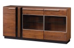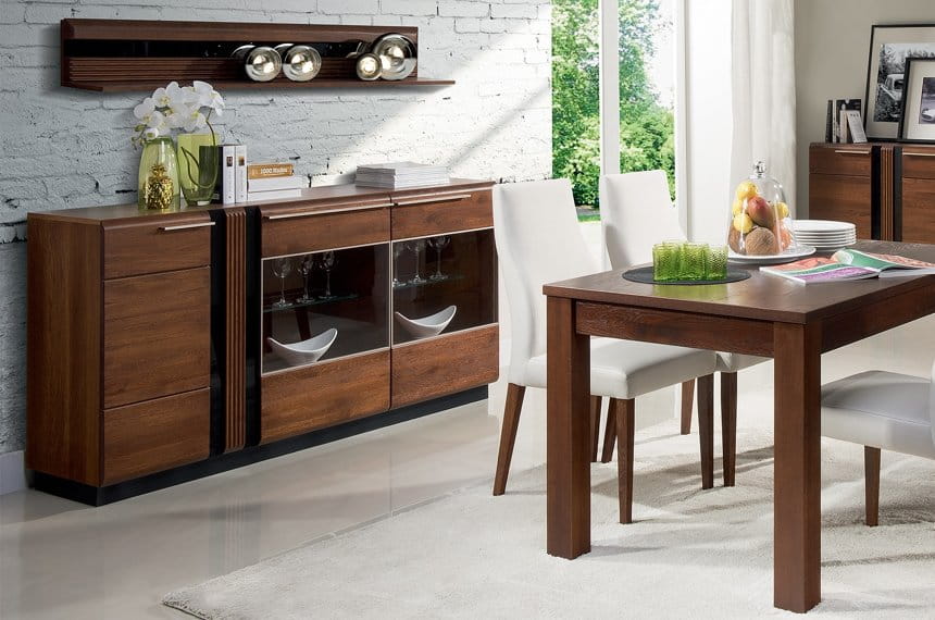 Należy przyznać, że kredens z częściowo przeszklonymi frontami z kolekcji PORTI jest pełna szyku, prezentuje się niebanalnie i elegancko. Lite drewno, aluminiowe ramki wykańczające przeszklenia oraz piękne ryflowane elementy ozdobne, w kolorze czarnym doskonale wpasowują się w aktualne trendy. Całość uzupełniają, dopełniają metalowe wykończenia. O wysokiej jakości wykonania mebla, nawet nie ma co dyskutować, bowiem jest znakomita, precyzyjna w każdym detalu. Spełni najbardziej wygórowane oczekiwania użytkowników.