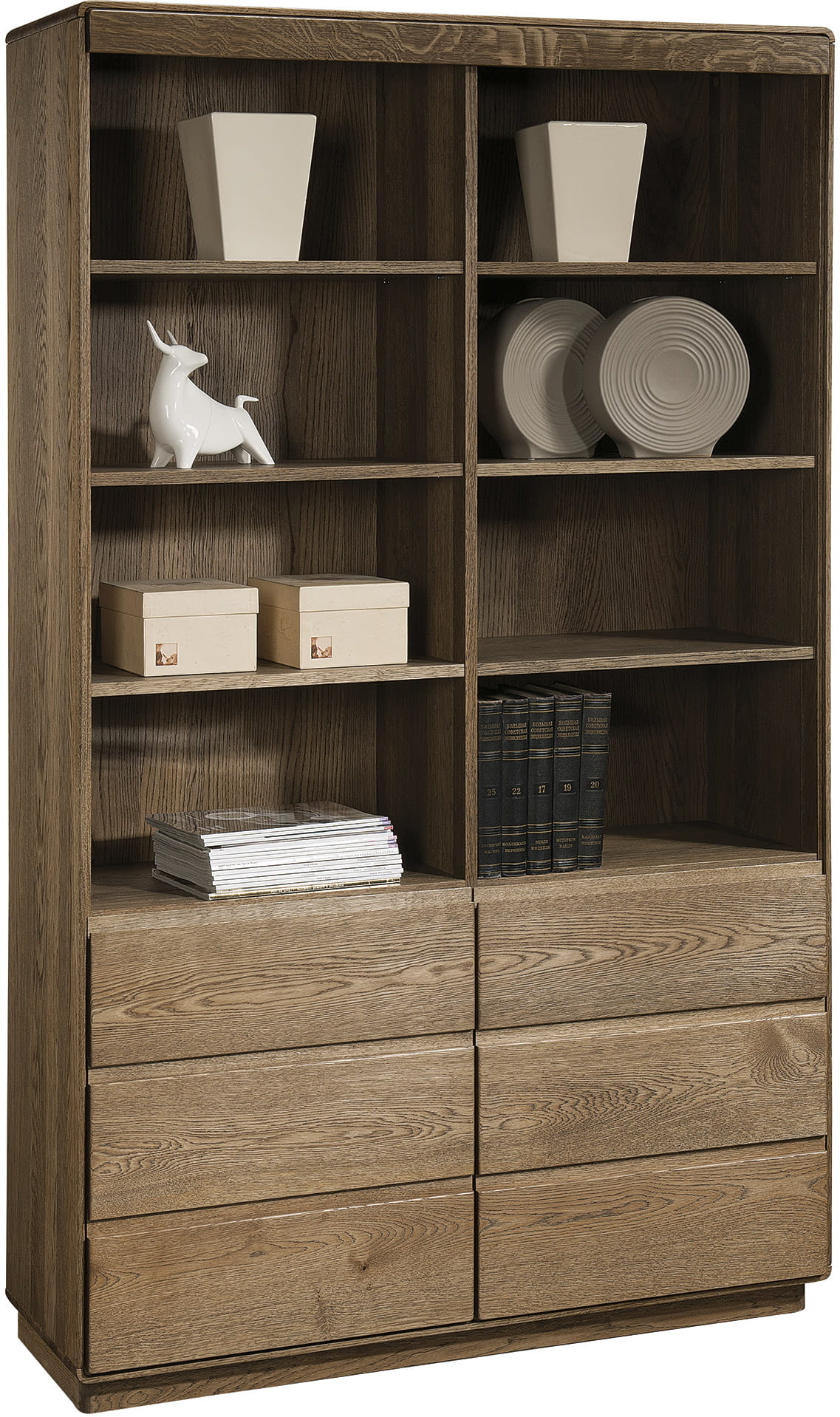 Ta oferta dotyczy regału otwartego z linii ATLANTA TYP 13 dąb palony wyposażonego w sumie, w 6 półek otwartych - świetnej propozycji praktycznego, funkcjonalnego mebla do wnętrza salonu lub sypialni, oraz 6 szuflad z cichym domykiem. Regał taki stanowi dodatkową przestrzeń do wyeksponowania książek, dekoracji, pamiątek rodzinnych.