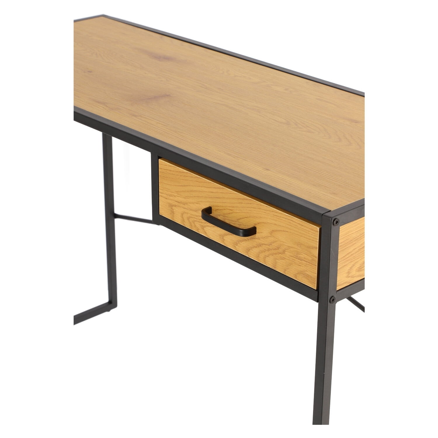 Biurko Oxford wykonane zostało z metalu malowanego proszkowo na kolor czarny oraz płyty MDF wykończonej laminatem w kolorze dębu. Pod blatem po prawej stronie została umieszczona szuflada. Szuflada została wyposażona w uchwyt w kolorze czarnym. Loftowy charakter i prostota wykonania to coś co wyróżnia serię mebli Oxford. Biurko wprowadzi surowy klimat oraz sprawdzi się w mniejszych pomieszczeniach dzięki swoim wymiarom.