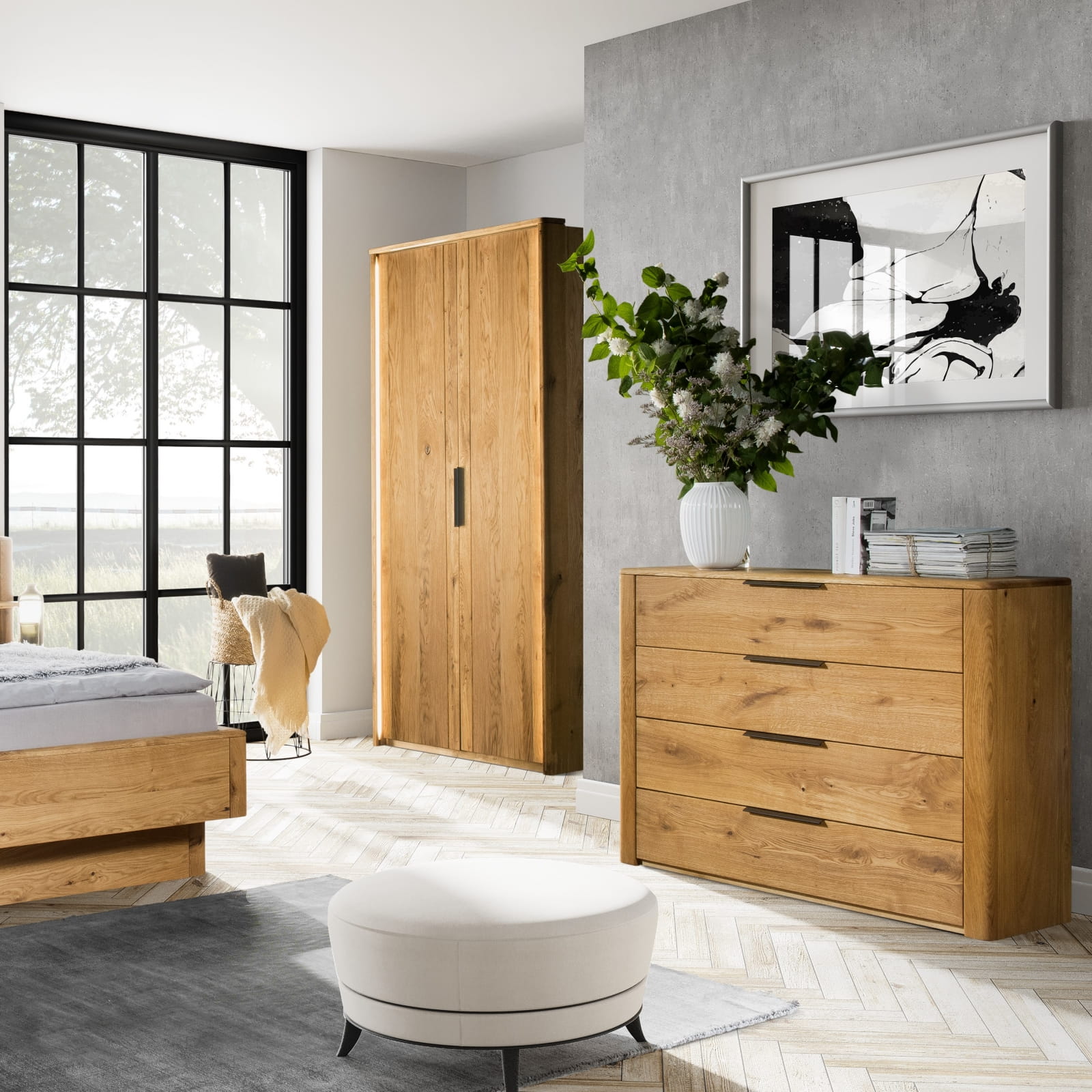 DENVER - kolekcja mebli wykonana z litego dębu uszlachetnionego olejem, który daje autentyczne właściwości materiałowe drewna. Ciepły naturalny kolor drewna emanuje przyjazną atmosferą, a sęki i szczotkowana powierzchnia nadają mocne akcenty. Zachwyca nowoczesnym, intensywnym materiałowo wzornictwem z zastosowaniem litego drewna dębowego i naturalnych materiałów. Miękkie szczotkowane powierzchnie podkreślają wyrazistość litego drewna i nadają przytulności oraz wartości. Przestrzeń sypialniana urządzona meblami z kolekcji Denver jest przysłowiowym strzałem w "10".