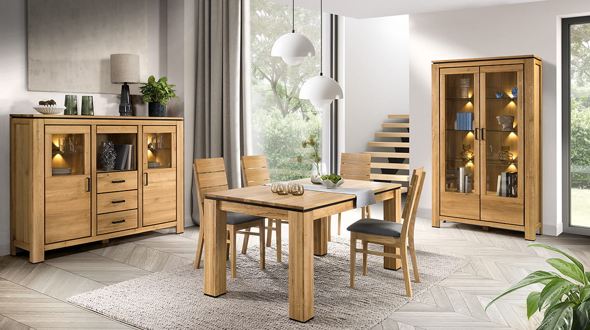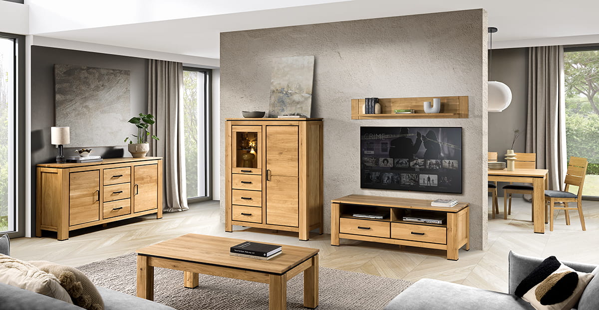 Kolekcja mebli FARO II, z dębiny sękatej z naturalną woskowaną i olejowaną powierzchnią, czarne dodatki i pełnymi wdzięku bryłami mebli wprowadzą do wnętrz salonu prawdziwy śródziemnomorski powiew.