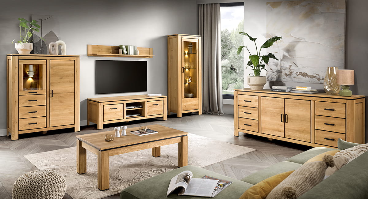 Kolekcja mebli FARO II, z dębiny sękatej z naturalną woskowaną i olejowaną powierzchnią, czarnymi dodatkami i pełnymi wdzięku bryłami mebli wprowadzą do wnętrz salonu prawdziwy śródziemnomorski powiew.