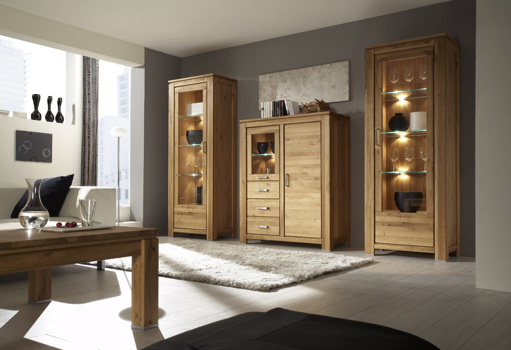 To, że drewno masywne wspaniale harmonizuje z domowym akcentem, dowodzą różne jednostki funkcyjne FARO. Witryny FARO obejmują cały rząd pojedynczych mebli o pięknej formie, które oferują najlepszą przestrzeń widokową i do ustawienia. Obojętnie czy schowane za drewnianymi frontami, czy widoczne zza szkła. Indywidualne urządzenie dla mieszkania i spożywania posiłków. Różne akcenty pięknie uzupełniają Państwa obecne umeblowanie.