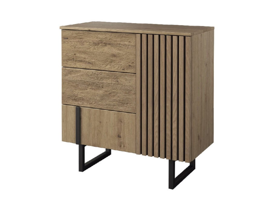 Kolekcję wyróżnia ciekawe wzornictwo wyrazistych brył. Łączy prostotę i minimalizm wyróżniające loft z ciepłem drewna dębowego oraz okleiny dębowej w pięknym kolorze dębu naturalnego o matowym odcieniu. Perfekcyjnie wyprofilowane metalowe nogi oraz wstawki w czarnym kolorze podkreślają oryginalną stylistykę mebli.