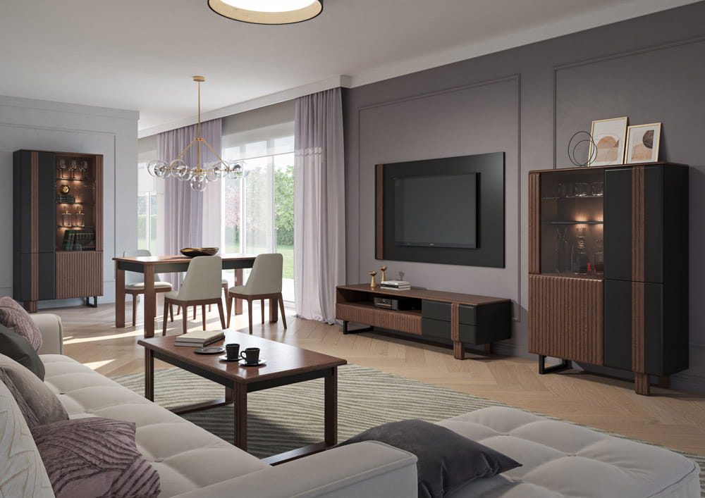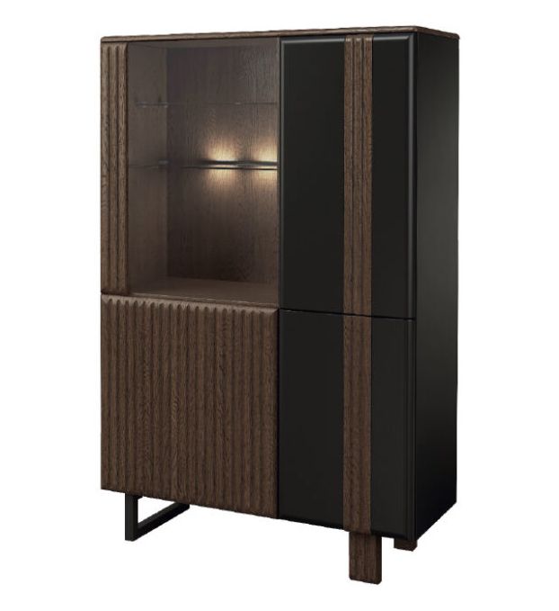 Prosta forma brył mebli idealnie współgra z oryginalnym wykończeniem w postaci pionowych lameli zastosowanych we frontach szafek, witryn i komód oraz brązowym szkłem antisol. Witryny z kolekcji ISLA wyposażone są w oświetlenie LED – punkty świetlne zamocowane na tylnych krawędziach szklanych półek. Kolekcja wyposażona jest w praktyczny system otwierania drzwi push to open.