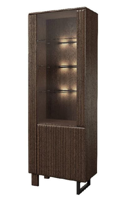 Prosta forma brył mebli idealnie współgra z oryginalnym wykończeniem w postaci pionowych lameli zastosowanych we frontach szafek, witryn i komód oraz brązowym szkłem antisol. Witryny z kolekcji ISLA wyposażone są w oświetlenie LED – punkty świetlne zamocowane na tylnych krawędziach szklanych półek. Kolekcja wyposażona jest w praktyczny system otwierania drzwi push to open.