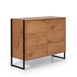Prosta, minimalistyczna komoda na czarnej metalowej ramie, wykonana z laminowanej płyty meblowej w ciepłym wykończeniu dąb Lancelot. Sześć praktycznych szuflad z systemem push & pull zapewnia dużo miejsca do przechowywania oraz wygodę użytkowania. Dekoracyjne, czarne metalowe elementy po bokach pełnią funkcję oryginalnych nóg, łącząc styl z funkcjonalnością.