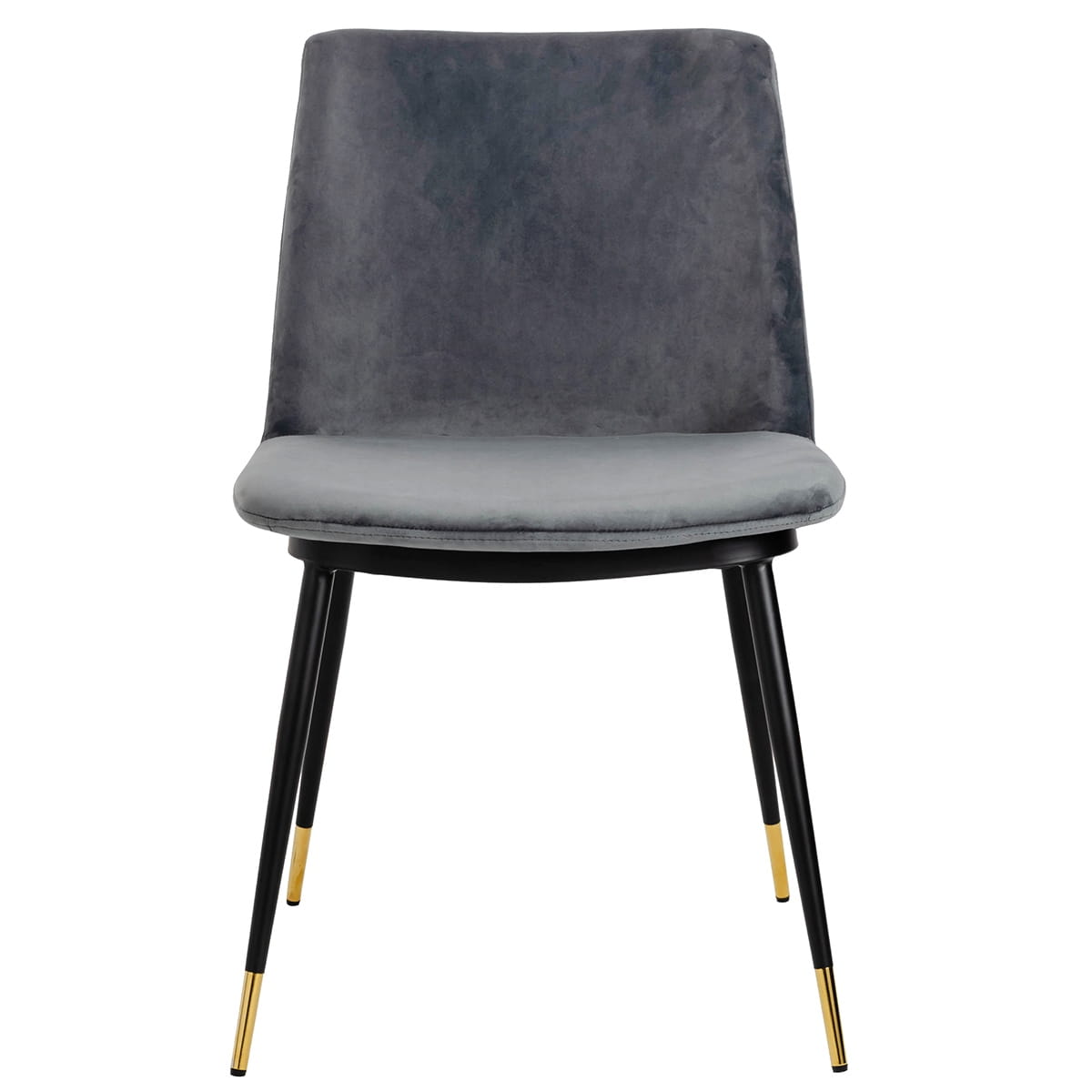 Krzesło DIEGO, którego siedzisko tapicerowane jest miękkim i przyjemnym w dotyku welurem, w kolorze szarym.