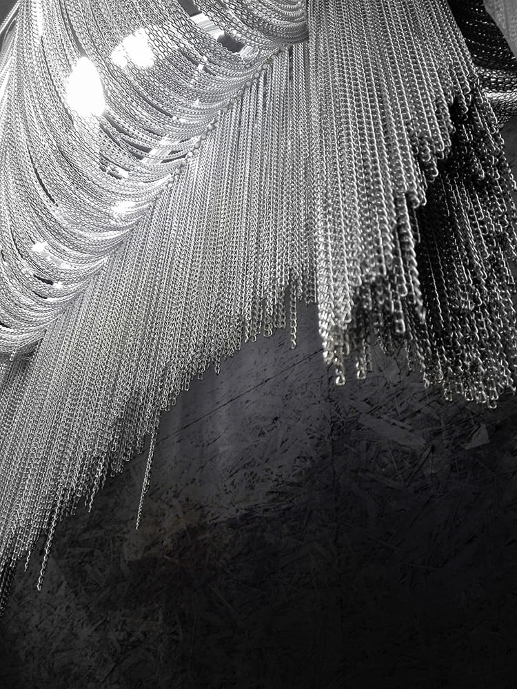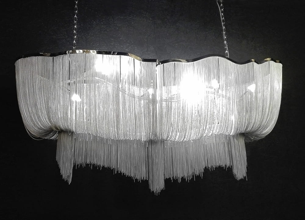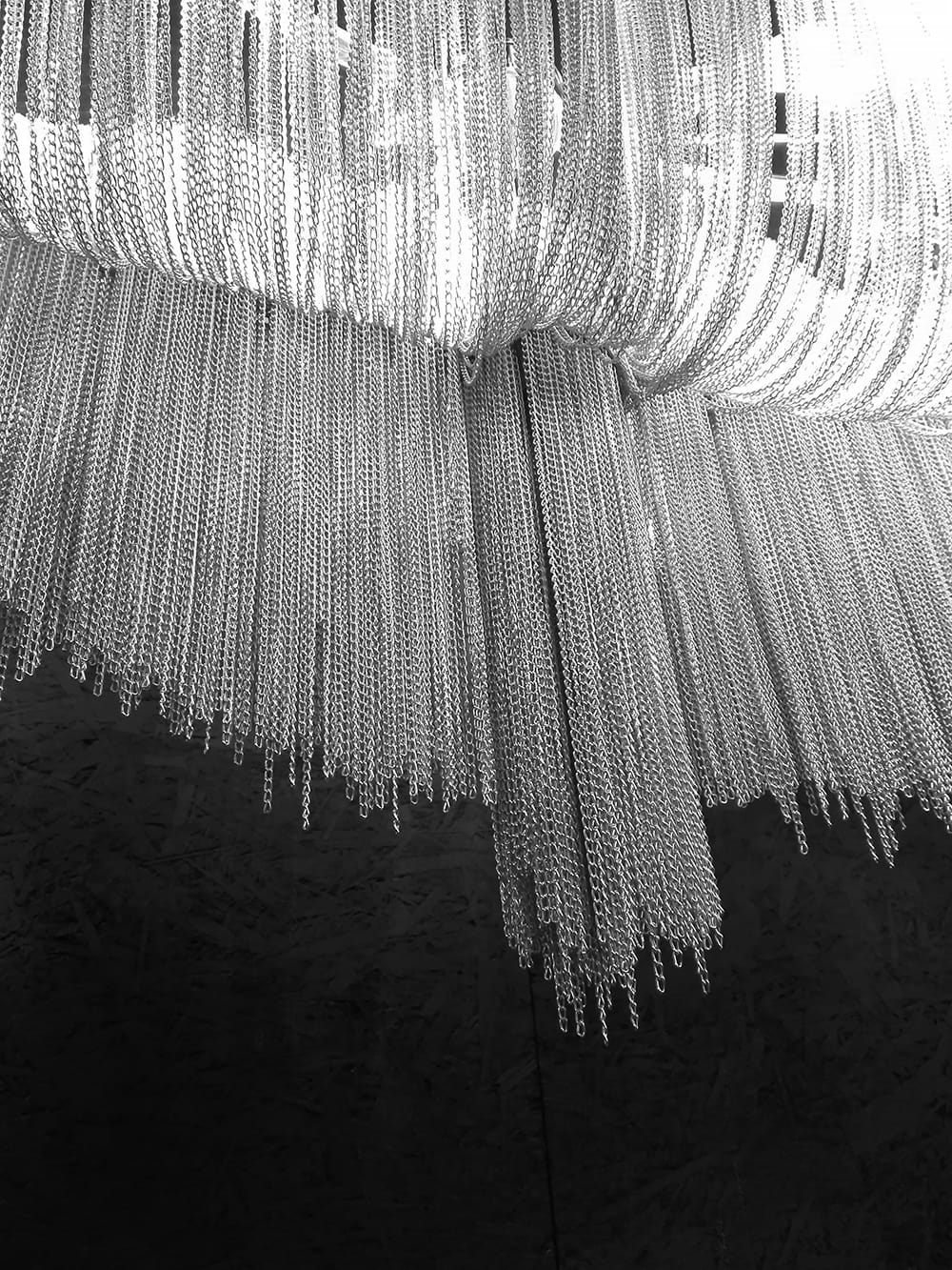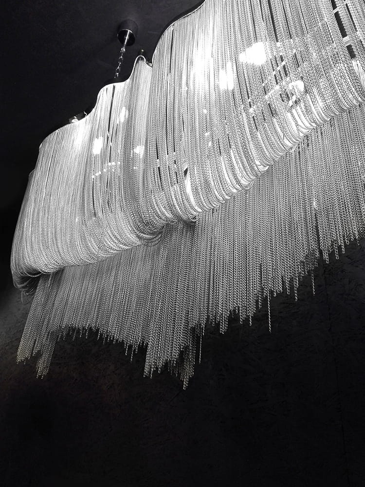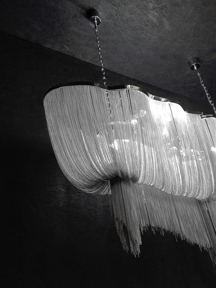 Atlanta Long to niezwykła lampa wisząca, inspirowana projektem Terzani Atlantis posiada nieregularne kształty, niczym fale oceanu. Została wykonana z aluminium i stalowych, drobnych łańcuchów, dzięki którym światło jest przyjemnie rozproszone, a sama lampa wygląda ekskluzywnie i elegancko. W środku lampy znajduje się aż 10 mocowań na żarówki, co daje całkiem intensywne i równomierne oświetlenie. Lampa Atlanta pasuje zarówno do salonów, czy sypialni, jak również do wszelkich stylowych przestrzeni,takich jak butiki, salony urody, czy hotele. Oprawa: wys. 250 cm / szer. 160 cm / gł. 40 cm Montaż: instalacja sufitowa.
