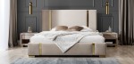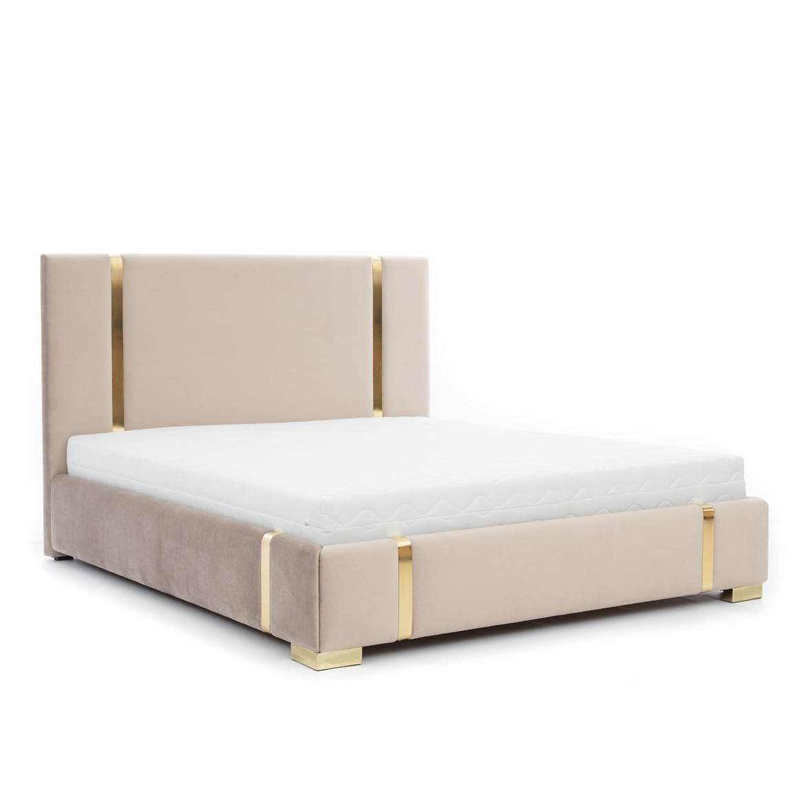 Łóżko tapicerowane New Elegance to elegancja i jakość. Jest odpowiedzią na najnowsze trendy w aranżacji sypialni. Wezgłowie oraz boki łóżka ozdobione jest złotymi listwami o szerokości 5 cm. Uroku dodają również złote nóżki. Łóżko które nada oryginalnego charakteru Twojej sypialni. Funkcjonalność łóżka zdecydowanie podnosi możliwość wzięcia podstawy z pojemnikiem na pościel.