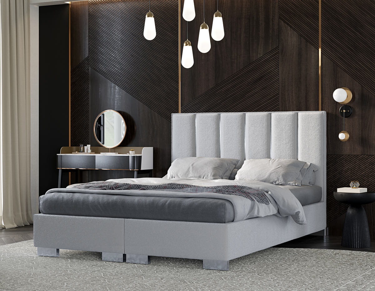 Wezgłowie z pionowymi kolumnami oraz minimalistyczne dodatki w kolorze srebra przyciągają wzrok i skupiają uwagę, stając się dominantą każdego wnętrza.