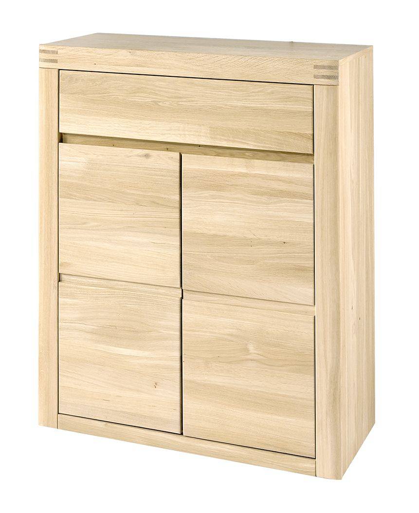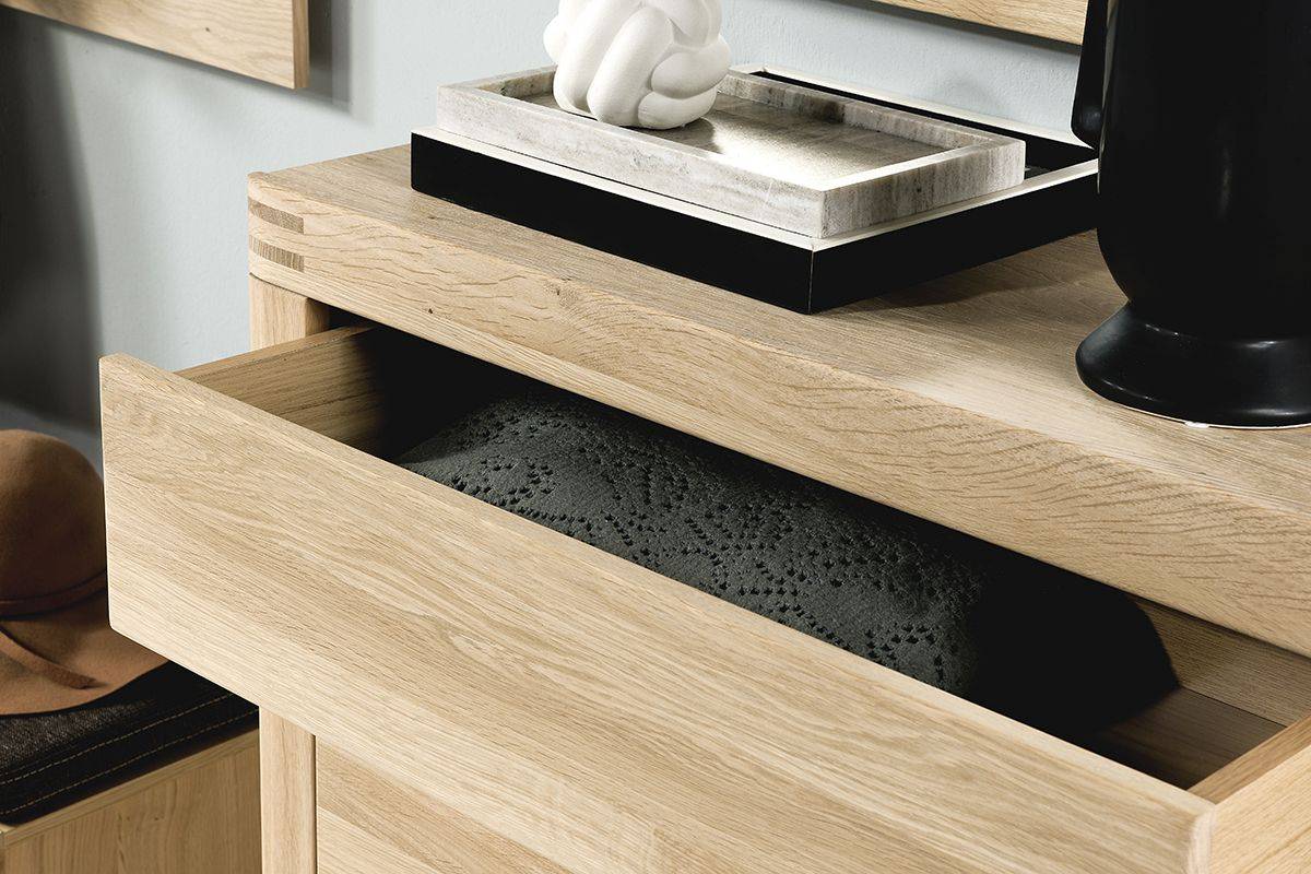 Fronty mebli są z masywnego drewna dębowego, łączonego tzw. metodą ciągową, korpusy natomiast, to płyta meblowa fornirowana naturalnym dębem. Powierzchnia mebli jest gładka, olejowana w wybarwieniu dąb BIANCO. Jasny, ciepły kolor drewna emanuje przyjazną atmosferą, a uszlachetniony olej wydobywa autentyczne właściwości materiałowe drewna.