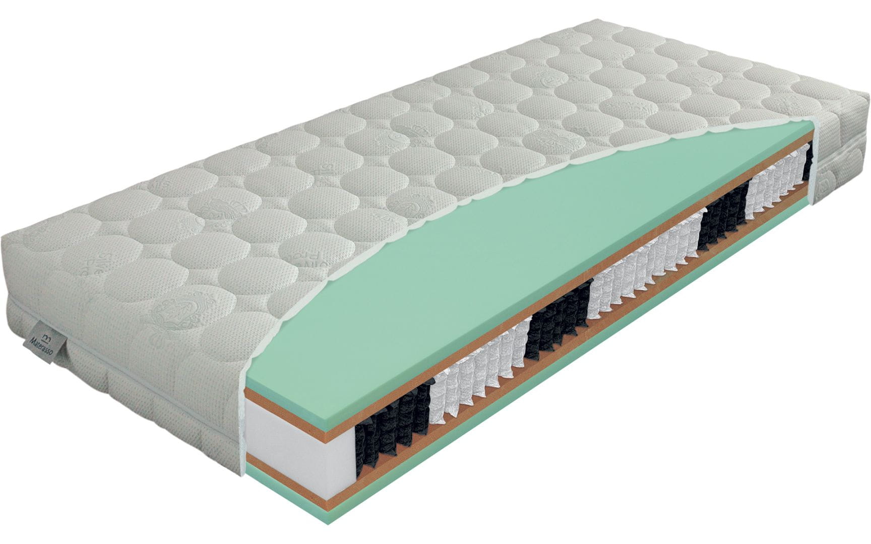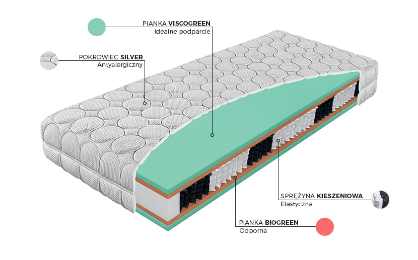 Rdzeń materaca stanowi z jednej strony to naturalna, włoska piana termoelastyczna VISCOGREEN, z drugiej, naturalna, włoska piana wysokoelastyczna BIOGREEN, oraz 7-strefowa sprężyna typu multipocket 1000S