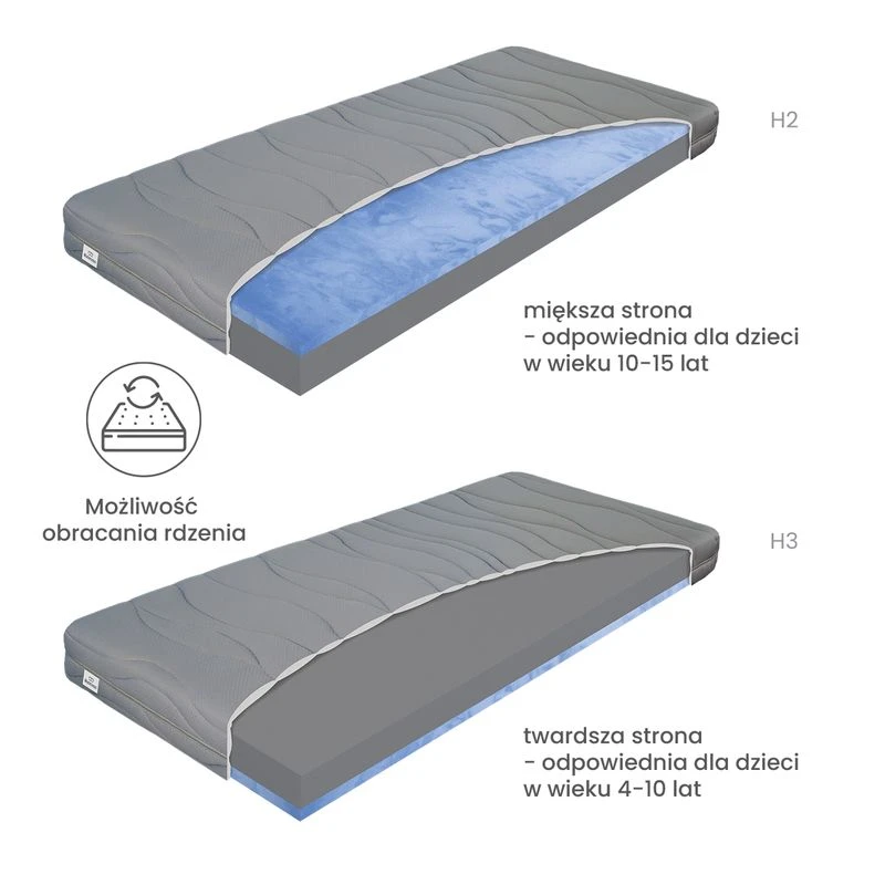 Dzięki możliwości wyboru twardości materac dostosowuje się do rosnącej osoby i „rośnie” wraz z dzieckiem.