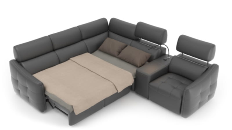 Kolekcja jest modułowa co pozwalazaaranżować wnętrza o róznej wielkości. Duży wybór nowolczesnych funkcji m. in regulowane elektrycznie zagłówki,dwa rodzaje funkcji spania (typ włoski i puma), oraz moduły wyposazone w lampkę ledową z regulacją jasności światła oraz port USB.