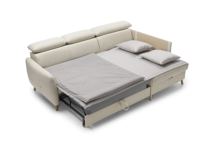 Nowoczesny rozkładany narożnik Hugo wykonany w skórze stanowi idealne wyposażenie niewielkich mieszkań. Wygodny zachęca do relaksu. Gdy oczekujesz gości możesz ją łatwo zmienić w praktyczne łóżko. Mocna konstrukcja w połączeniu z piankową wyściółką zapewnia wysoki komfort i przyjemność użytkowania przez długi czas. Ruchome zagłówki sprawiają, że Hugo staje się jeszcze bardziej wygodne.