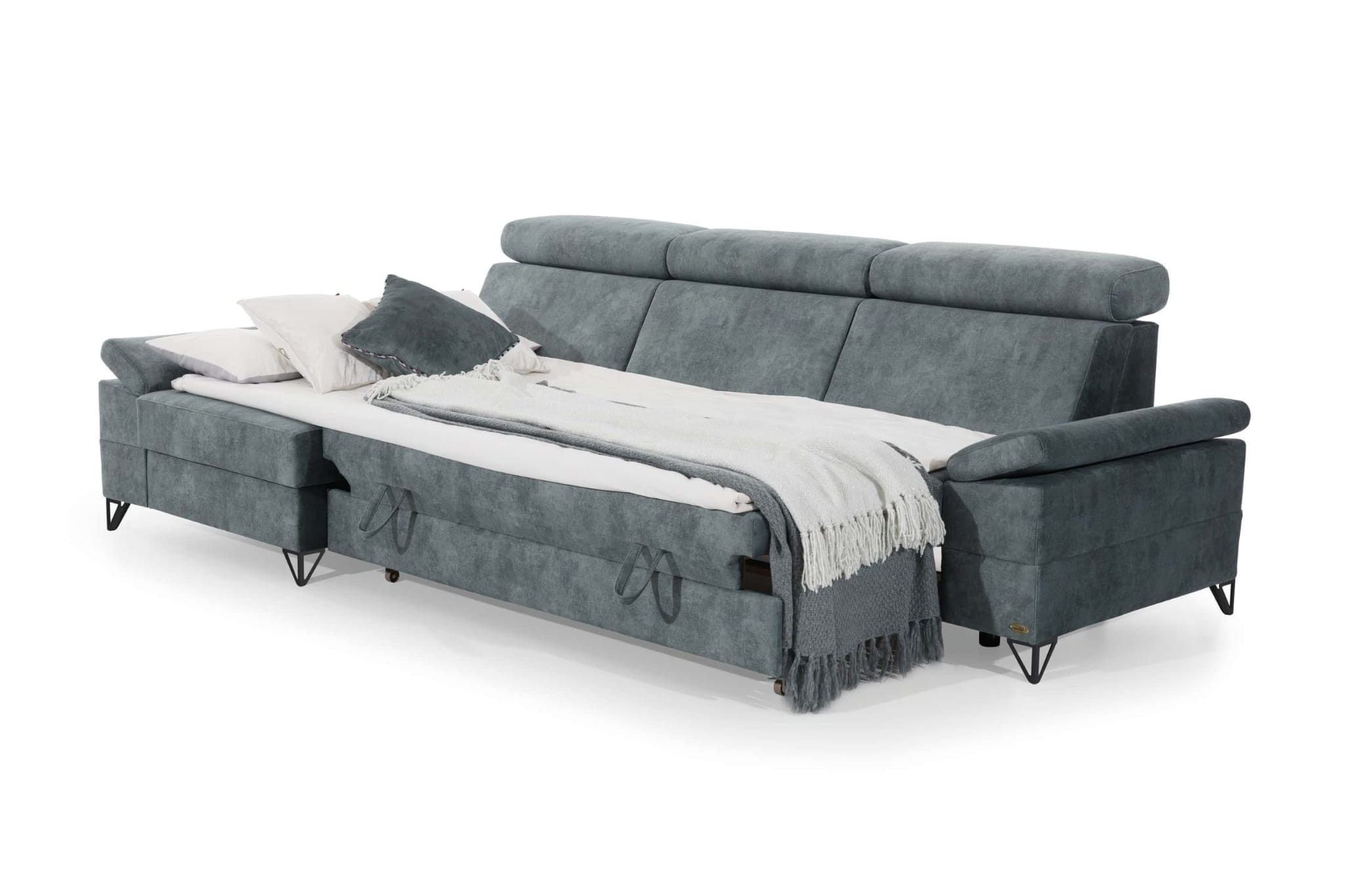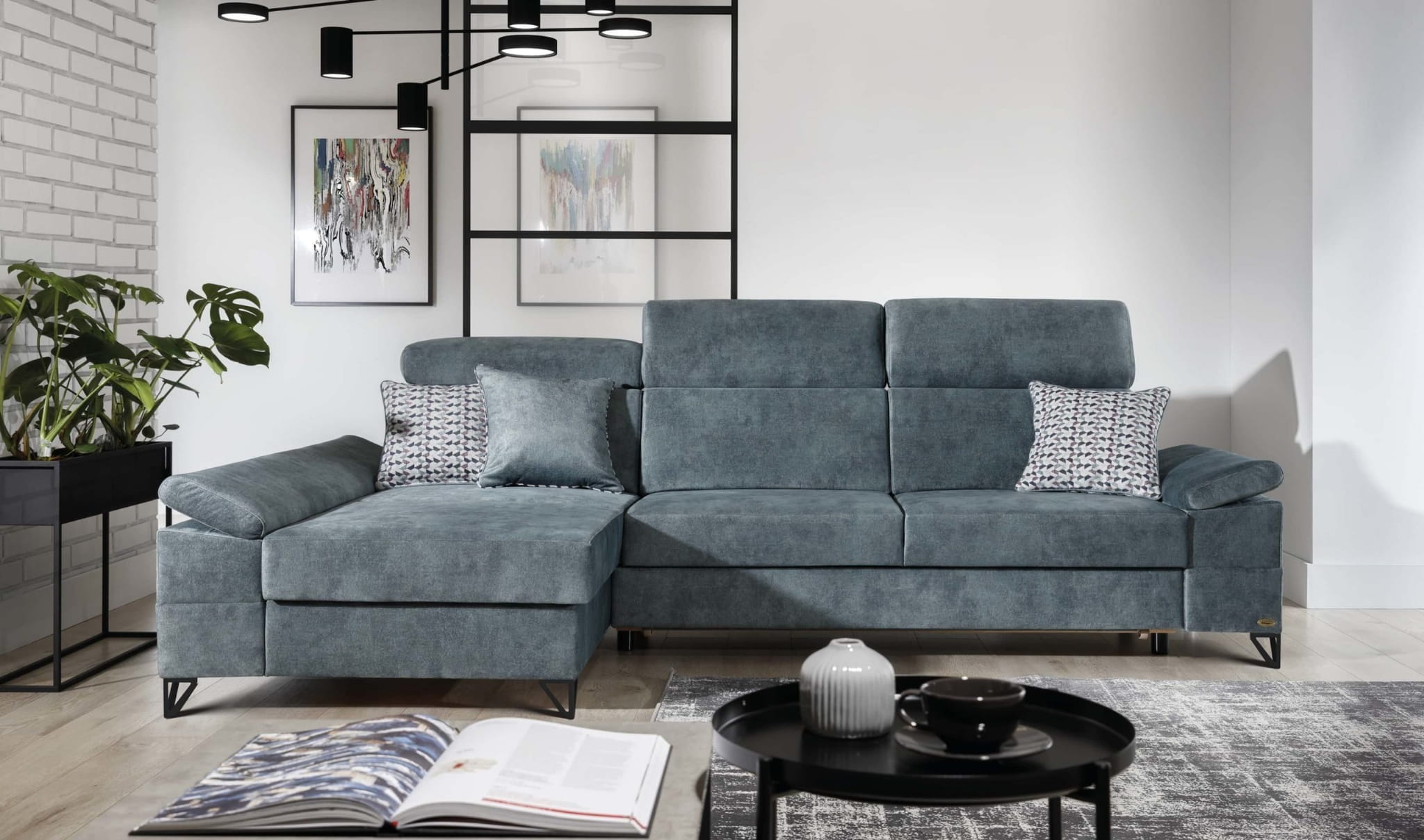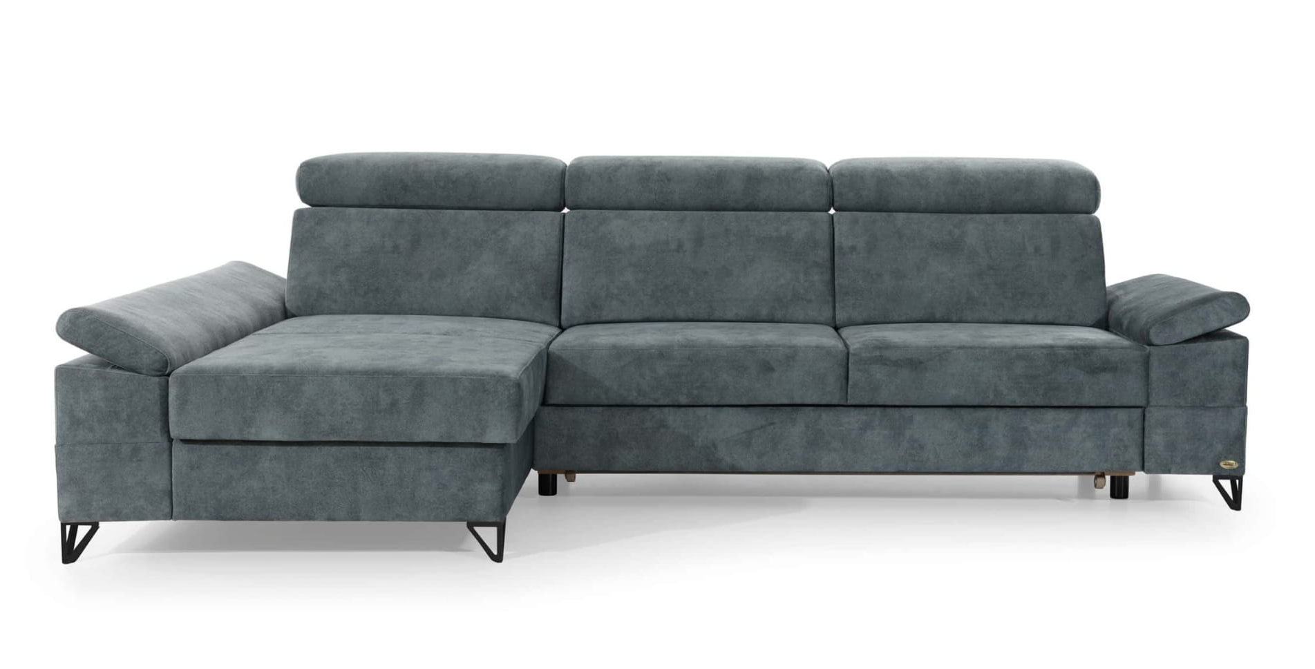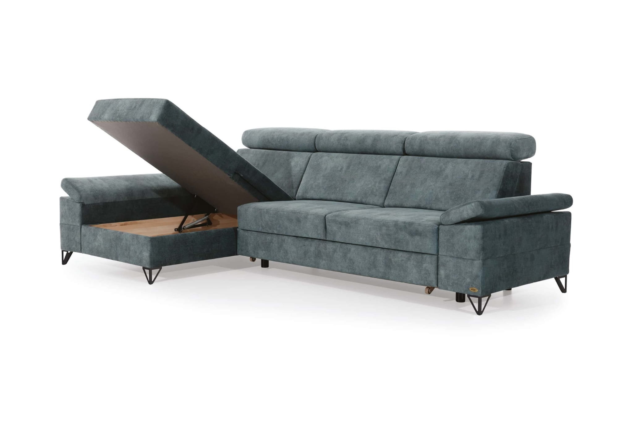Mebel posiada obszerny pojemnik w otomanie i rozkładaną funkcję spania o powierzchni 236x114 cm. Komfort z użytkowania podnoszą regulowane zagłówki i podłokietniki. Poduszki prezentowane na zdjęciach nie stanowią wyposażenia.