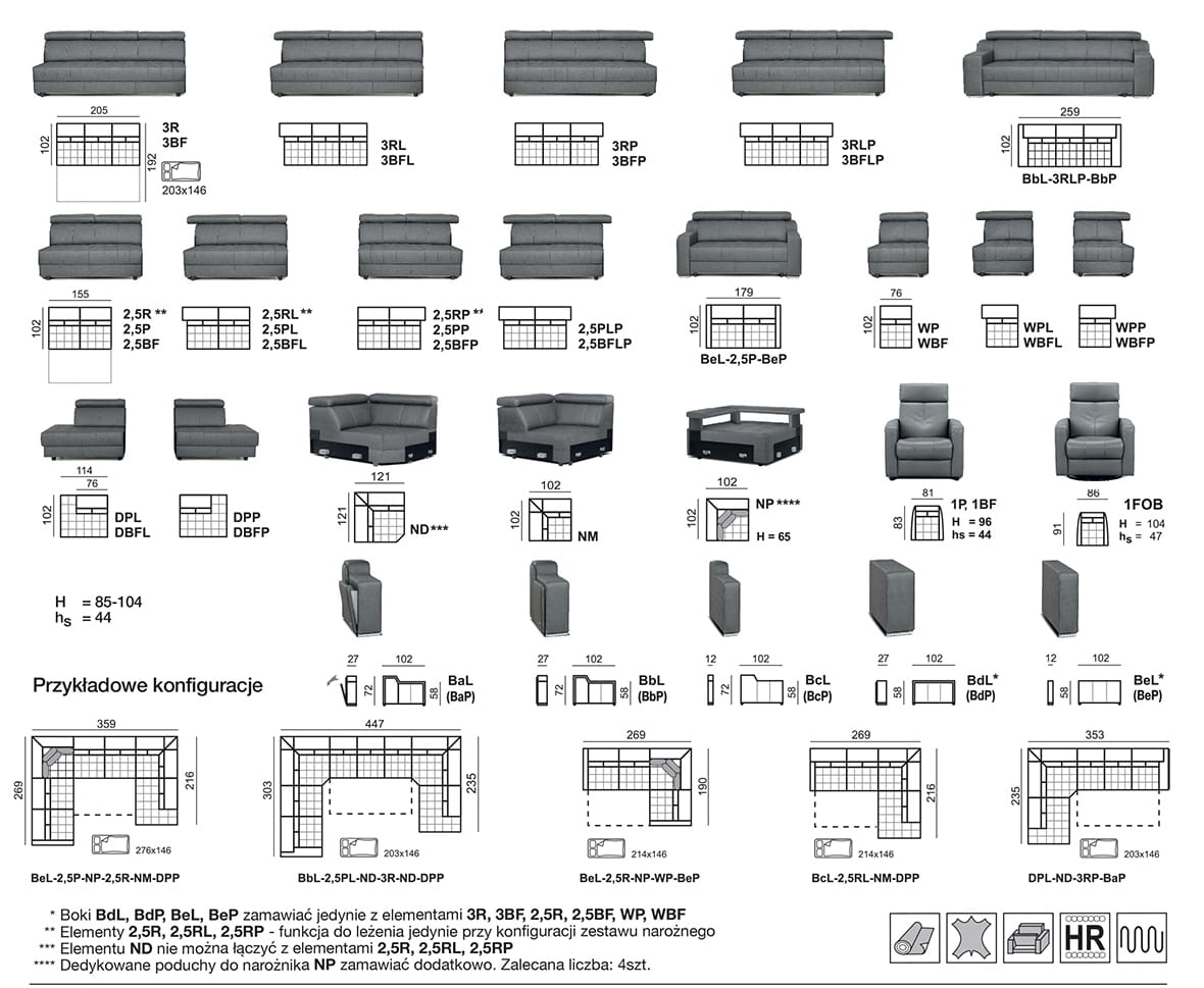 Ergonomia dzięki modułowości, różnorodność dostawek i elementów narożnych pozwala na uzyskanie oryginalnych układów oraz rozmiarów mebla dostosowanych do własnej fantazji i możliwości. Do wyboru kilka rodzajów konfiguracji zagłówków, kilka rodzajów boków i różne wielkości modułów.