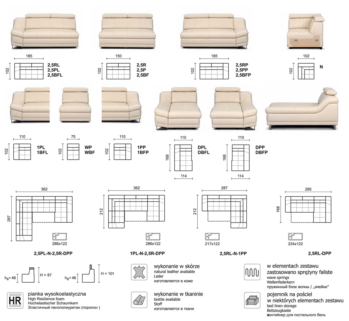 - wypełnienie: w elementach zestawu zastosowano sprężyny faliste i pianka wysokoelastyczna