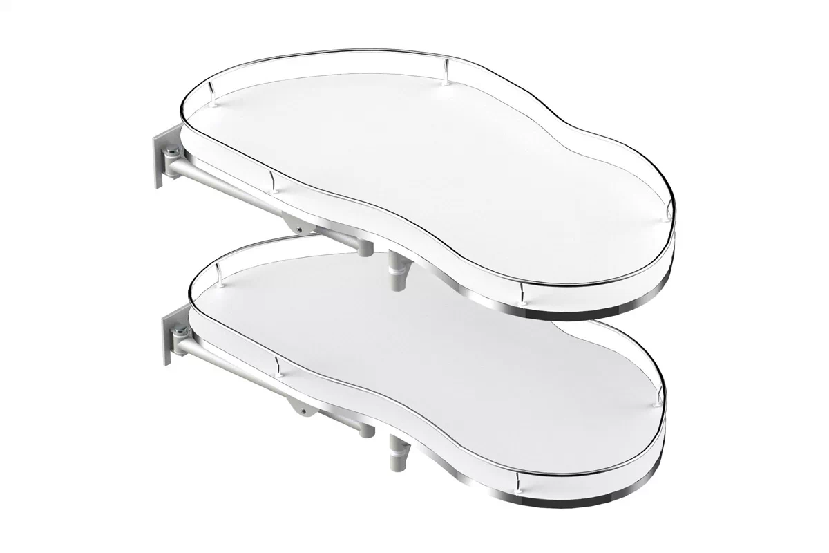 Metalowa półka obrotowa w kolorze chromu, o wymiarach odpowiednich dla modułu narożnego DPRP115x65 w systemie mebli kuchennych KAMMONO. Wygoda przechowania, ułatwiony dostęp i dwa poziomy stanowią istotne zalety rozwiązania.