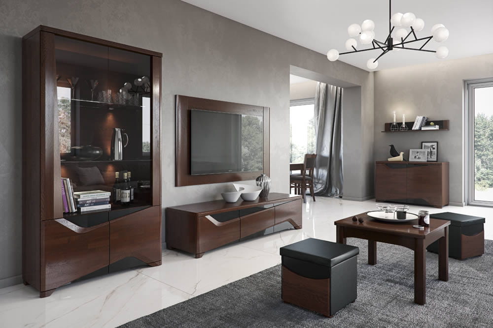 RIMINI - kwintesencja elegancji, prostota i umiar. Piękno naturalnych materiałów, drewna i okleiny dębowej, nowoczesna technologia, doskonałe wzornictwo i perfekcyjne wykonanie to cechy wyróżniające Rimini, wysmakowaną kolekcję mebli przeznaczoną do salonu i jadalni. Funkcjonalność kolekcji gwarantuje oświetlenie LED w standardzie oraz nowoczesny system otwierania PUSH TO OPEN. Elegancki dąb burgundzki o ciemnej głębokiej brązowej barwie, w zestawieniu z naturalnymi materiałami i szkłem Antisol tworzy nastrojową kompozycję, kreującą wnętrza o niepowtarzalnym uroku.