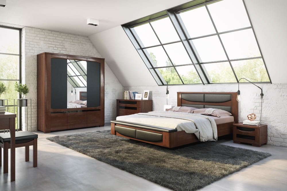 Kolekcja Riva to meble w stylu nowoczesnym, przeznaczone do jadalni i sypialni. Elegancki dąb burgundzki o ciemnej, głębokiej brązowej barwie, w zestawieniu z naturalnymi materiałami i szkłem Antisol tworzy nastrojową kompozycję, kreując wnętrza o niepowtarzalnym uroku. Meble sprawiają wrażenie masywnych i ciężkich, ale odpowiednie proporcje geometrycznych form, wprowadzają ład i harmonię opartą na symetrii. Koresponduje z nią perfekcyjne wykończenie łagodnie zaoblonych krawędzi. Efektowne, gięte uchwyty nadają bryłom szczególnej elegancji i wdzięku. Delikatny rysunek słojów drewna o nieregularnych liniach sprawia, że powierzchnie blatów, frontów i cokołów zyskują dekoracyjną strukturę.