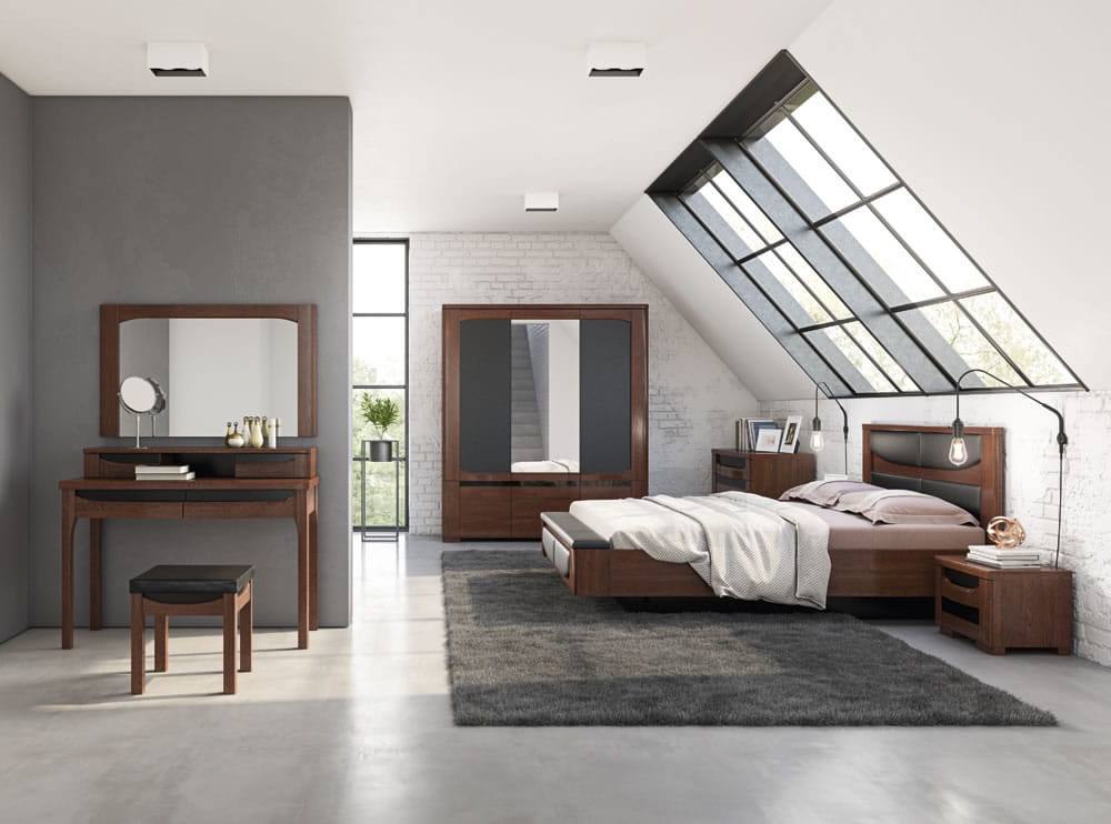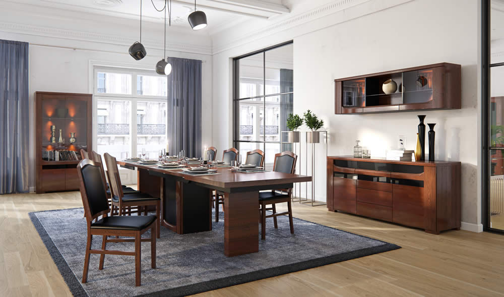 Kolekcja Riva to meble w stylu nowoczesnym, przeznaczone do jadalni i sypialni. Elegancki dąb burgundzki o ciemnej, głębokiej brązowej barwie, w zestawieniu z naturalnymi materiałami i szkłem Antisol tworzy nastrojową kompozycję, kreując wnętrza o niepowtarzalnym uroku. Meble sprawiają wrażenie masywnych i ciężkich, ale odpowiednie proporcje geometrycznych form, wprowadzają ład i harmonię opartą na symetrii. Koresponduje z nią perfekcyjne wykończenie łagodnie zaoblonych krawędzi. Efektowne, gięte uchwyty nadają bryłom szczególnej elegancji i wdzięku. Delikatny rysunek słojów drewna o nieregularnych liniach sprawia, że powierzchnie blatów, frontów i cokołów zyskują dekoracyjną strukturę.