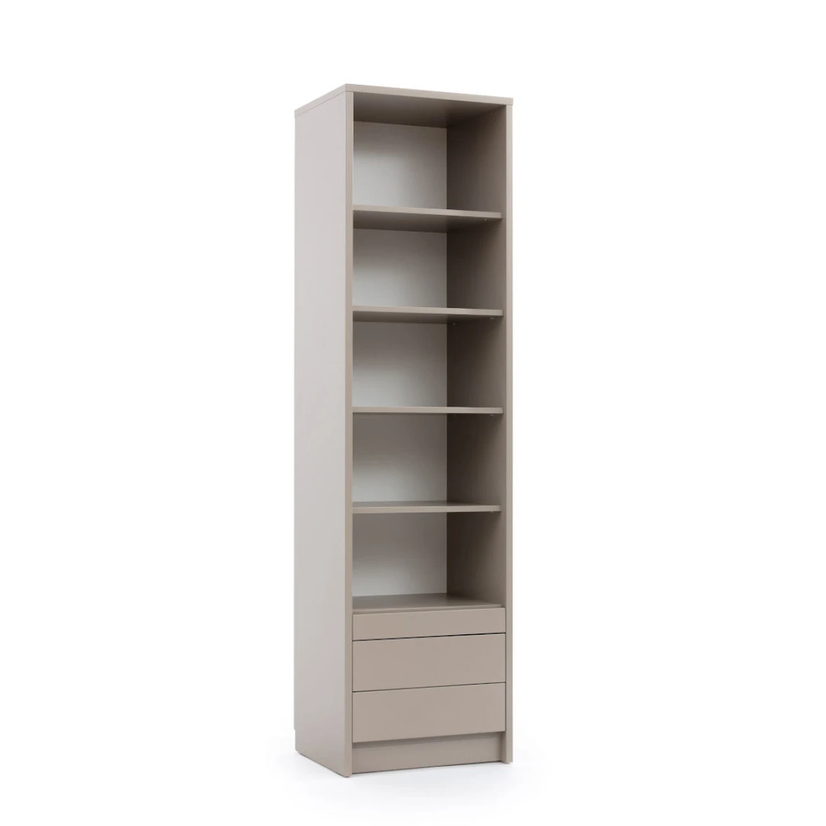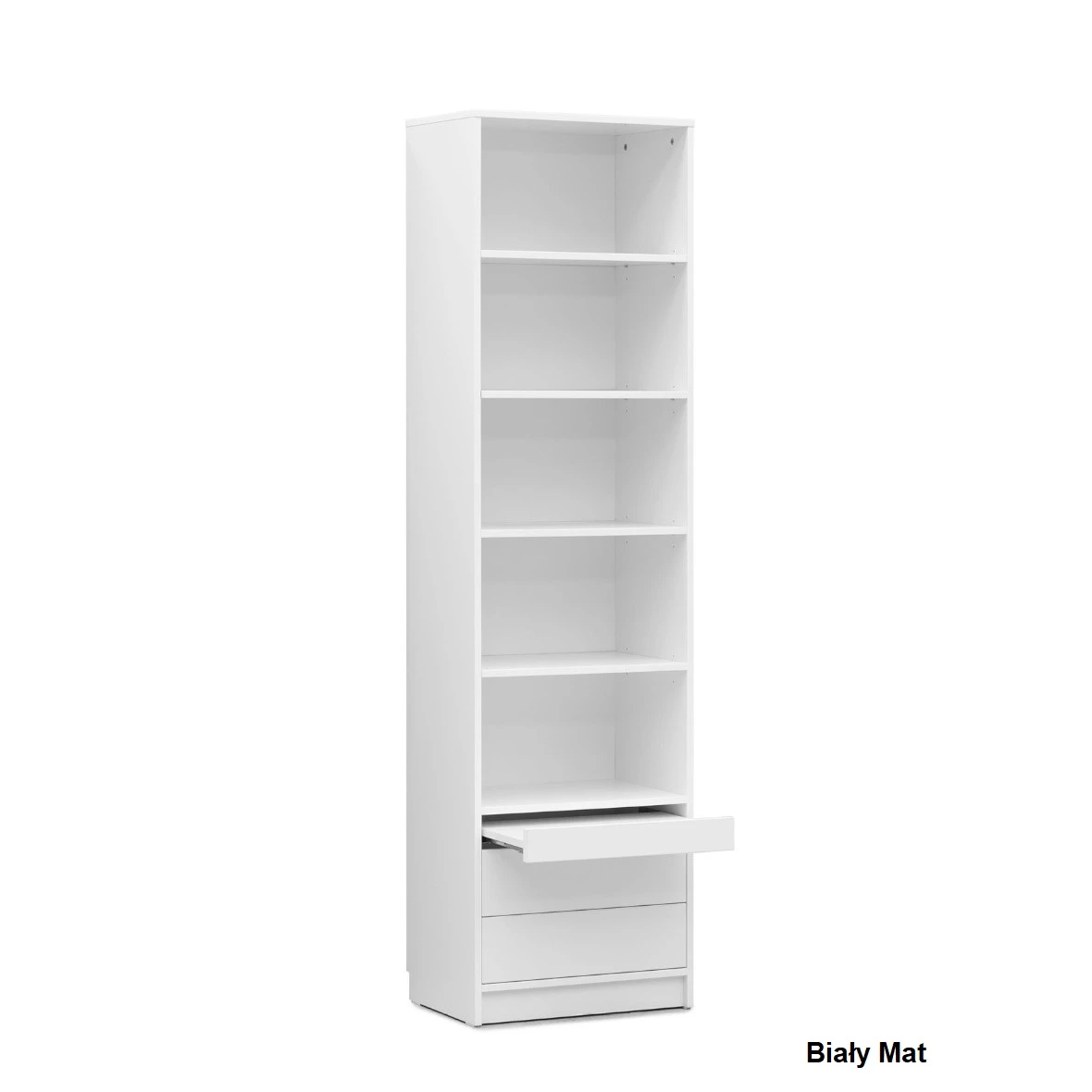 Regał wykonany jest z płyty laminowanej, co gwarantuje jego trwałość i odporność na uszkodzenia. System otwierania "push to open" oraz pięć wnęk z czterema półkami, dwie szuflady i stolik zapewniają funkcjonalność i komfort użytkowania. Obrzeża wykonane są z ABS, a plecy z płyty HDF, co dodatkowo zwiększa wytrzymałość mebla. Jego minimalistyczny design i uniwersalna kolorystyka sprawią, że będzie ono pasować do różnych aranżacji, a jednocześnie podkreślać indywidualny charakter pomieszczenia.
