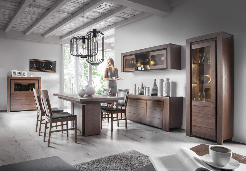 Sempre to niepowtarzalna kolekcja mebli do salonu, jadalni i sypialni. Doskonale zaprezentują się w nowocześnie zaaranżowanych, przestronnych wnętrzach. Meble o prostej, geometrycznej linii, łagodnie zaokrąglonej na krawędziach i dwóch wersjach kolorystycznych: rustikal i brąz antyczny idealnie wpisują się w modny nurt współczesnej klasyki pełnej umiaru, harmonii i naturalnego piękna. Być może wytrawne oko konesera dostrzeże w uchwyceniu formy, połączeniach materiałowych czy wykończeniu nieśmiałą fascynację nurtem art déco, jednak całość jest jak najbardziej osadzona w stylistyce XXI wieku. W programie do salonu, pokoju dziennego i jadalni znajduje się szeroki wybór witryn stojących i wiszących, barków, szafek, komód, regałów i mebli TV. Kolekcję uzupełniają krzesła i stoły: klasyczny rozsuwany, na nodze kolumnowej oraz praktyczny ławostół z funkcją podnoszenia i rozsuwania blatu. Z kolei propozycje do sypialni to łóżka dostępne w 3 wymiarach, szafki nocne, toaletka, komoda oraz szafy: dwu, trzy i czterodrzwiowa.