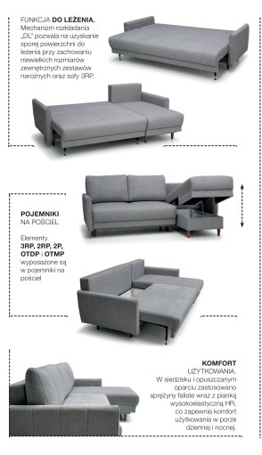 Spokojna forma mebla sprawia, że pasuje on do pomieszczeń nowoczesnych i stylowych, a nieduża sofa z tej kolekcji jest idealna do niewielkich pomieszczeń. Bardzo często jest wybierany przez użytkowników jako pojedynczy mebel do sypialni, przedpokoju, poczekalni czy kawiarenki. Sofa w wersji 3RP oferuje wygodny wypoczynek - to model z funkcją spania o powierzchni 198x144 cm i pojemnik na pościel.