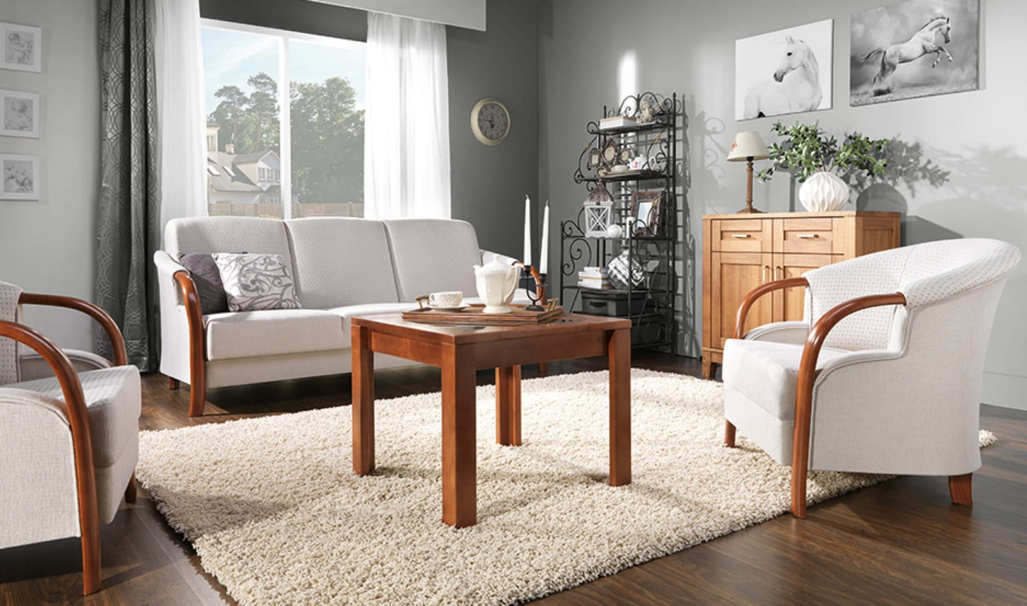 OLIWIA D - kolekcja mebli wypoczynkowych w skład której wchodzi: fotel, sofa nierozkładana, sofa rozkładana i wersalka. Są to klasyczne meble do salonu z eleganckimi wstawkami z naturalnego drewna.