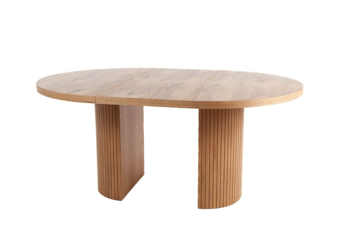Stół wyposażony jest w blat o grubości 4 cm, wykonany z naturalnego forniru dębowego, który pięknie eksponuje strukturę drewna, dodając wnętrzu ciepła i elegancji. Centralna, ryflowana noga z litego drewna dębowego nie tylko stabilizuje całą konstrukcję, ale również pełni funkcję ozdobną, nadając stołowi nowoczesny i designerski charakter.