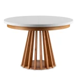 Stół zachwyca okrągłym blatem z naturalnej okleiny oraz ażurową podstawą wykonaną z litego drewna dębowego, starannie lakierowanego. Delikatnie zaokrąglona, podfrezowana krawędź dodaje mu lekkości i wdzięku. To projekt, który powstał i został w całości zrealizowany w Polsce, z najwyższą dbałością o detale.