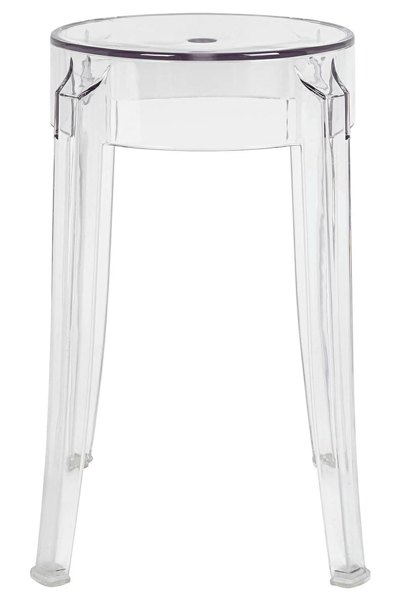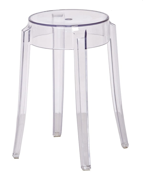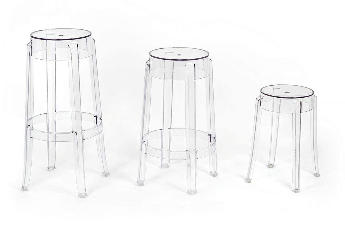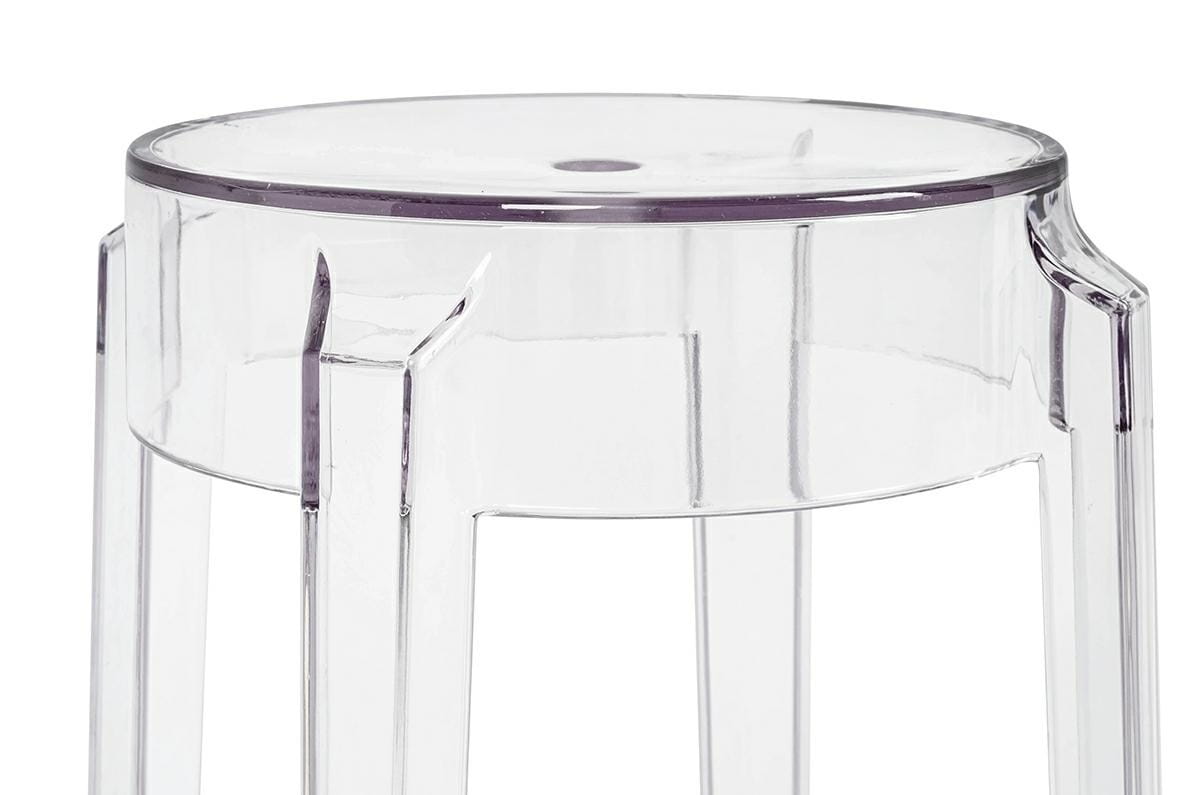 Stołek CHARLES, estetyczny niski hoker, w całości wykonany z transparentnego poliwęglanu, wyjątkowego materiału, wyróżniającego się świetnymi parametrami technicznymi i użytkowymi.
