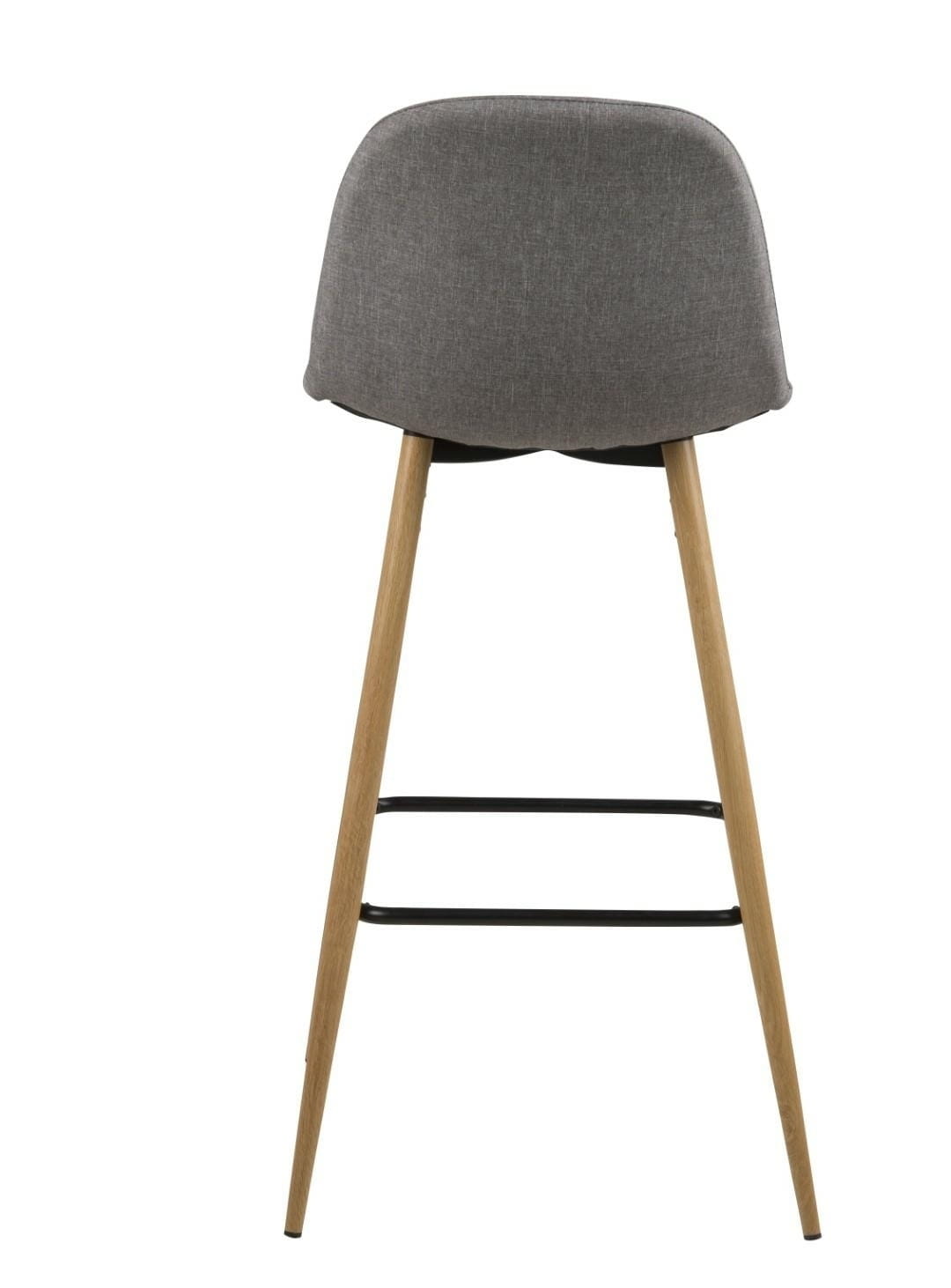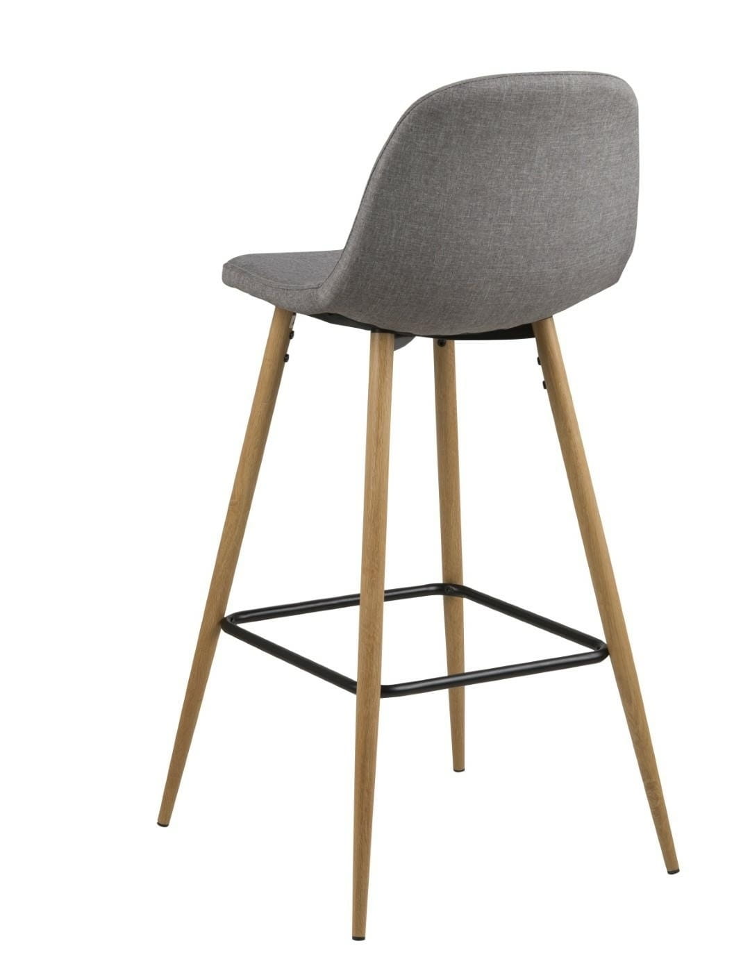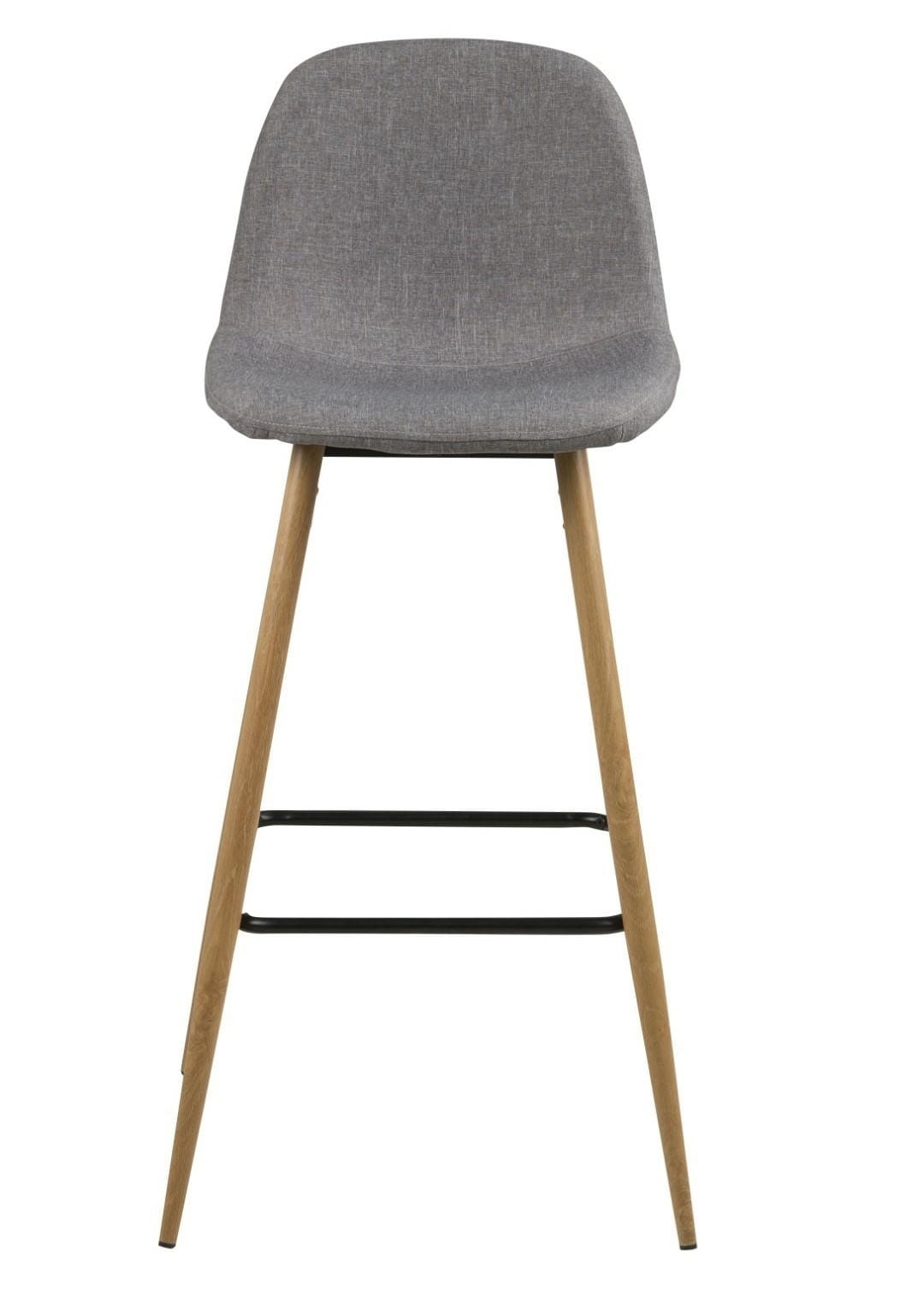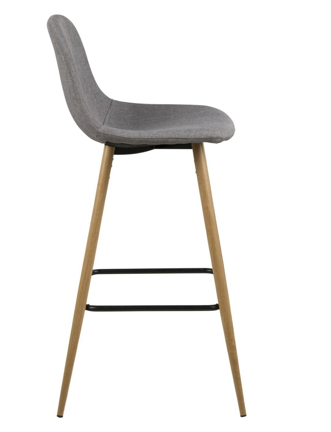 Wilma to zgrabne, bardzo nowoczesny stołek barowy. Charakteryzuje go ciekawa tkanina Sawana light grey 21, którą został obity. Siedzisko oraz oparcie są lekko wyprofilowane aby zapewnić jak najwygodniejszą pozycję do siedzenia. Podstawą stołka są metalowe nogi w kolorze dębu . Ciekawego kontrastu całości dodaje czarny wspornik, który pełni również funkcję podnóżka.
