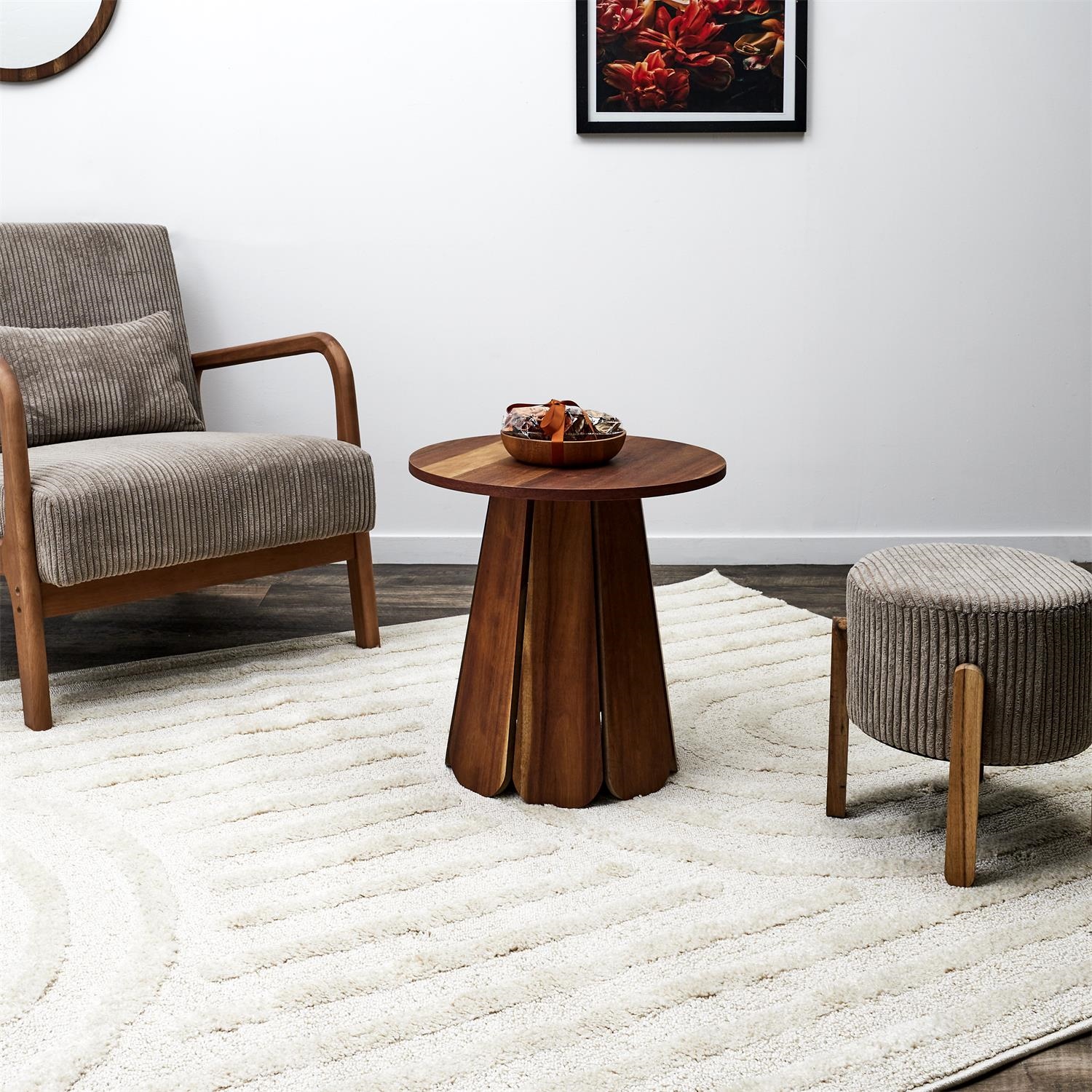 Stolik boczny Will wykonany został z płyty MDF w okleinie w kolorze drewna orzecha. Stolik z okrągłym blatem wyposażony został w pojedynczą nogę, która składa się z 8 deseczek idealnie wyprofilowanych. Stolik wymaga montażu.