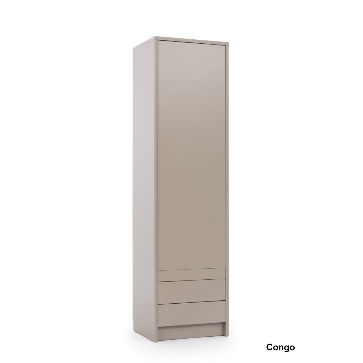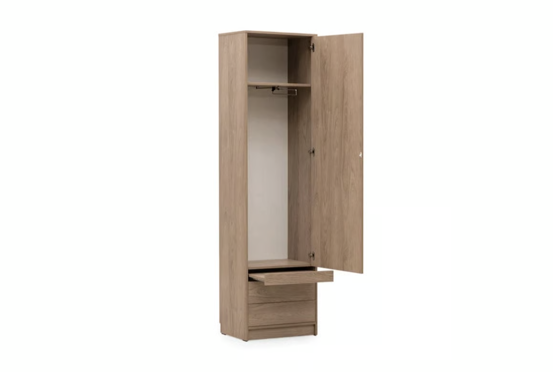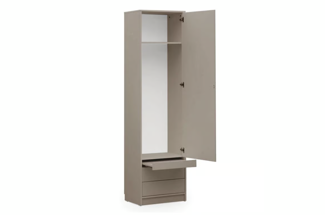 Szafa wykonana jest z płyty laminowanej o grubości 18 mm, co gwarantuje jego trwałość i odporność na uszkodzenia. Szafa wyposażona jest w jeden wieszak, dwie szuflady, stolik i półkę, co umożliwia efektywne wykorzystanie przestrzeni. Obrzeża wykonane są z ABS, a plecy z płyty HDF, co dodatkowo zwiększa wytrzymałość mebla. Jego minimalistyczny design i uniwersalna kolorystyka sprawią, że będzie ono pasować do różnych aranżacji, a jednocześnie podkreślać indywidualny charakter pomieszczenia.