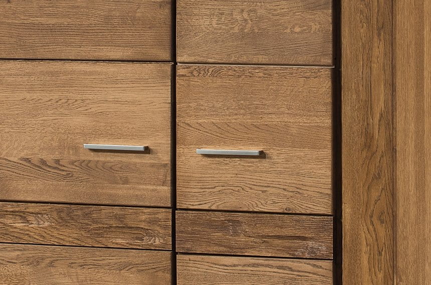 Fronty szafy wykonano z litego drewna dębowego, a korpus z płyty meblowej fornirowanej naturalną okleiną dębową. Całość utrzymana jest w ciepłej kolorystyce dębu rustical, która pięknie eksponuje usłojenie drewna i nadaje wnętrzu przytulności. Metalowe, dwupunktowe uchwyty idealnie komponują się z naturalnym wykończeniem, podkreślając wysoką jakość i charakter mebla.