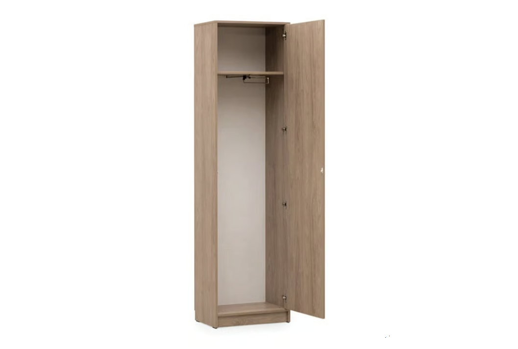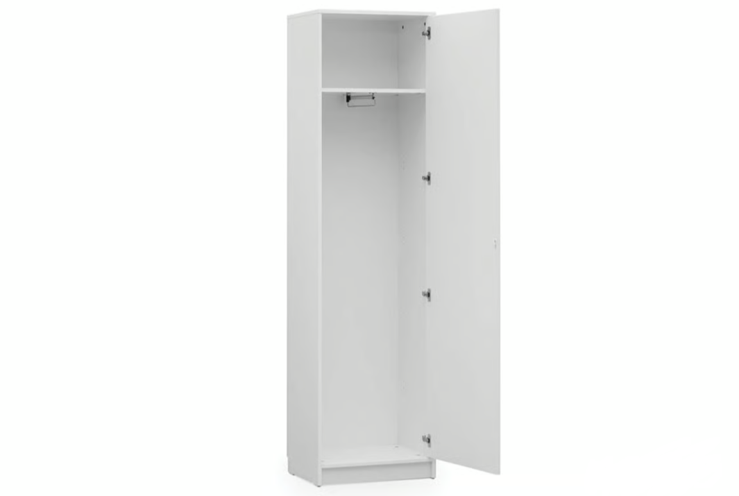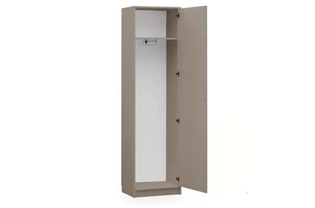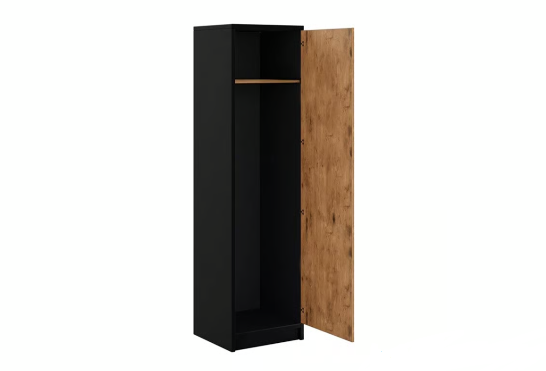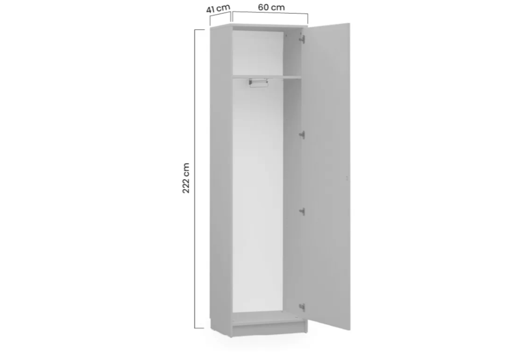 Szafa wykonana jest z płyty laminowanej o grubości 18 mm, co gwarantuje jego trwałość i odporność na uszkodzenia. Wyposażona jest w jeden wieszak na ubrania i jedną półkę, co pozwala na efektywne zagospodarowanie przestrzeni. Obrzeża wykonane są z ABS, a plecy z płyty HDF, co dodatkowo zwiększa wytrzymałość mebla. Jego minimalistyczny design i uniwersalna kolorystyka sprawią, że będzie ono pasować do różnych aranżacji, a jednocześnie podkreślać indywidualny charakter pomieszczenia.