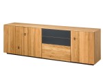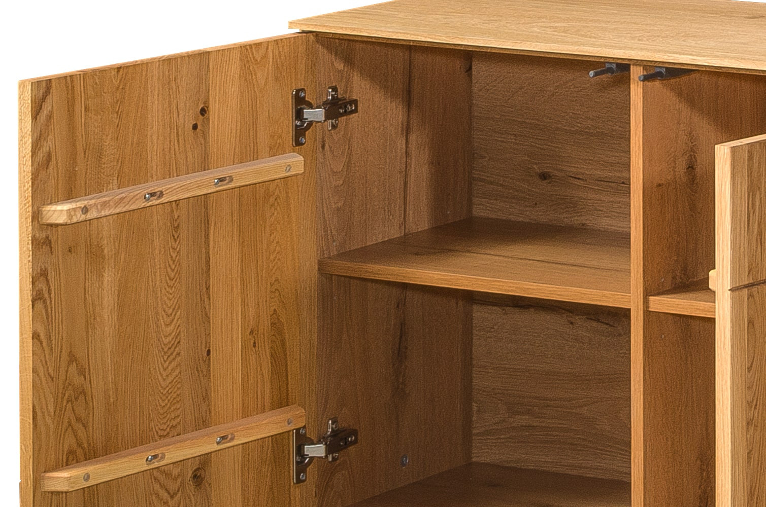 Fronty szafki RTV wykonano z litego dębu łupanego i szczotkowanego, który nie tylko zachwyca usłojeniem i fakturą, ale także podkreśla ciepłą kolorystykę dębu naturalnego. Konstrukcja zewnętrzna to płyta meblowa w naturalnej okleinie dębowej, natomiast wnętrze zostało wykończone płytą meblową w dekorze drewnopodobnym – to gwarancja trwałości i estetyki.