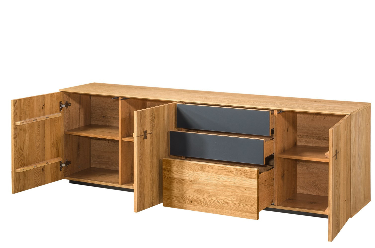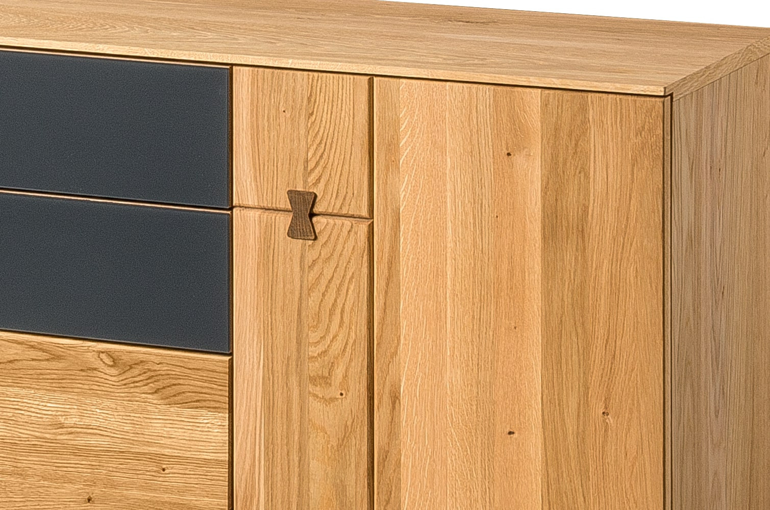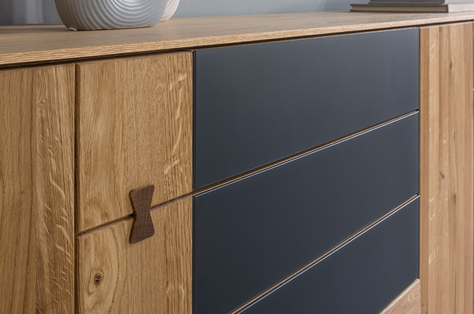 Minura to kolekcja, w której naturalne piękno litego drewna dębowego spotyka się z nowoczesnym wzornictwem i funkcjonalnymi rozwiązaniami. Połączenie ciepłego odcienia dębu natura sękatego z grafitowymi elementami i hartowanym szkłem sprawia, że meble prezentują się elegancko i współcześnie, a jednocześnie wnoszą do wnętrza przytulność i harmonię. Kolekcja Minura to inwestycja w jakość, styl i trwałość. Naturalne materiały, charakterystyczne detale, nowoczesne rozwiązania technologiczne oraz ponadczasowa forma sprawiają, że meble te doskonale odnajdują się zarówno w aranżacjach nowoczesnych, jak i klasycznych.