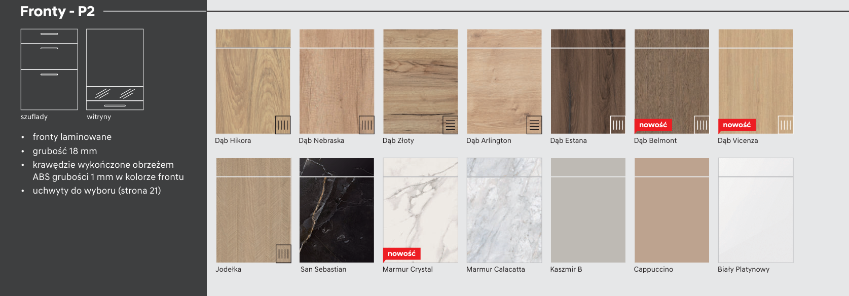 - Fronty: frezowane, wykonane z wysokiej jakości płyty MDF foliowanej