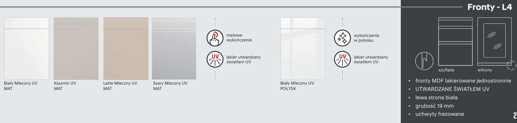 - Fronty: frezowane, wykonane z wysokiej jakości płyty MDF foliowanej