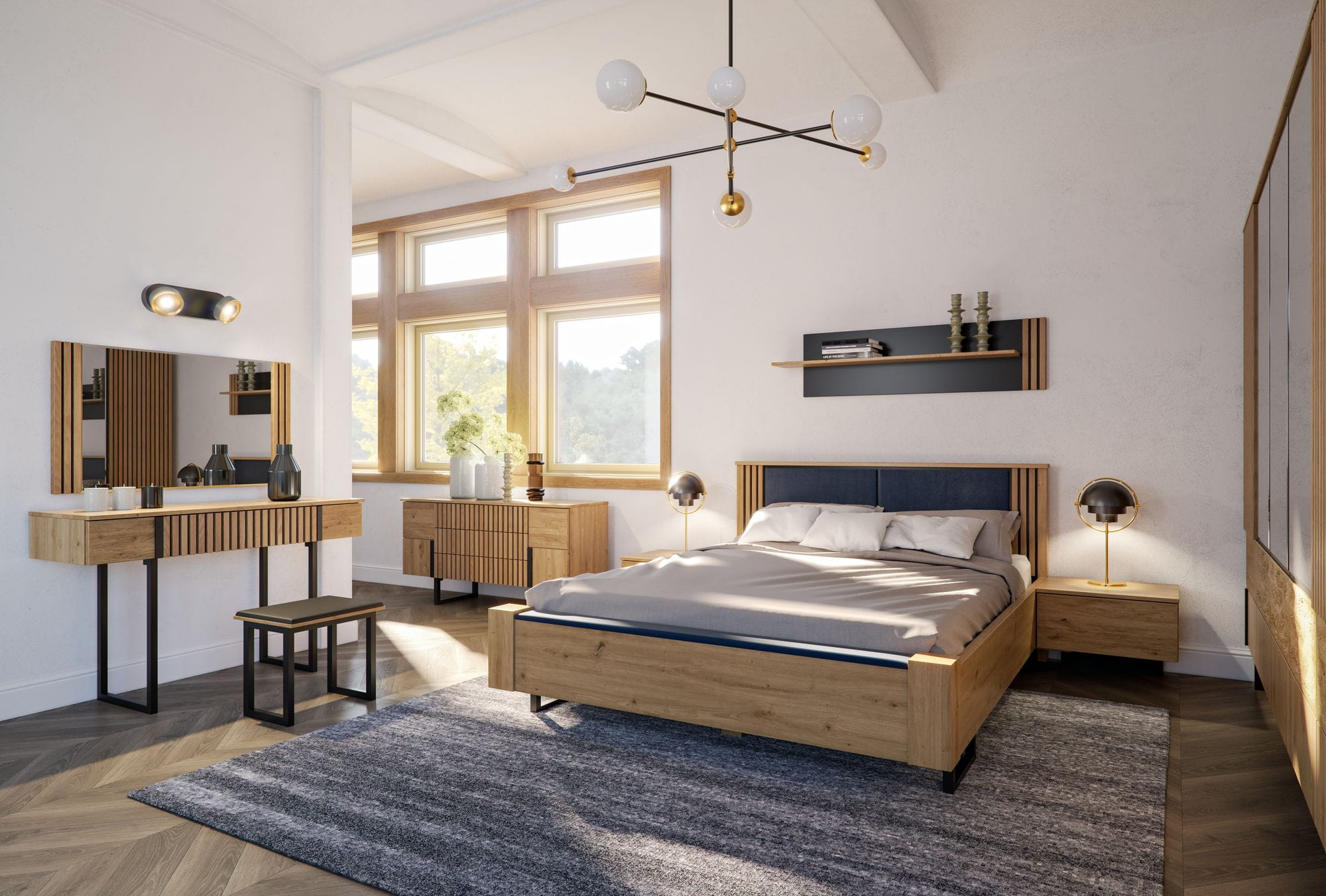 Kolekcję wyróżnia ciekawe wzornictwo wyrazistych brył. Łączy prostotę i minimalizm wyróżniające loft z ciepłem drewna dębowego oraz okleiny dębowej w pięknym kolorze dębu naturalnego o matowym odcieniu. Perfekcyjnie wyprofilowane metalowe nogi oraz wstawki w czarnym kolorze podkreślają oryginalną stylistykę mebli.