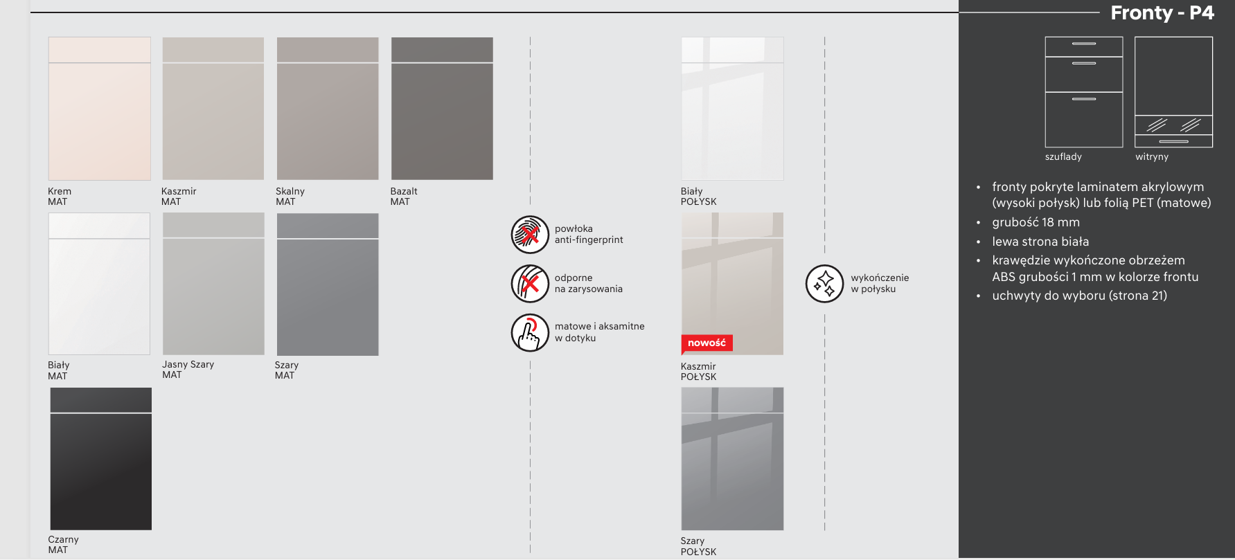- Fronty: frezowane, wykonane z wysokiej jakości płyty MDF foliowanej