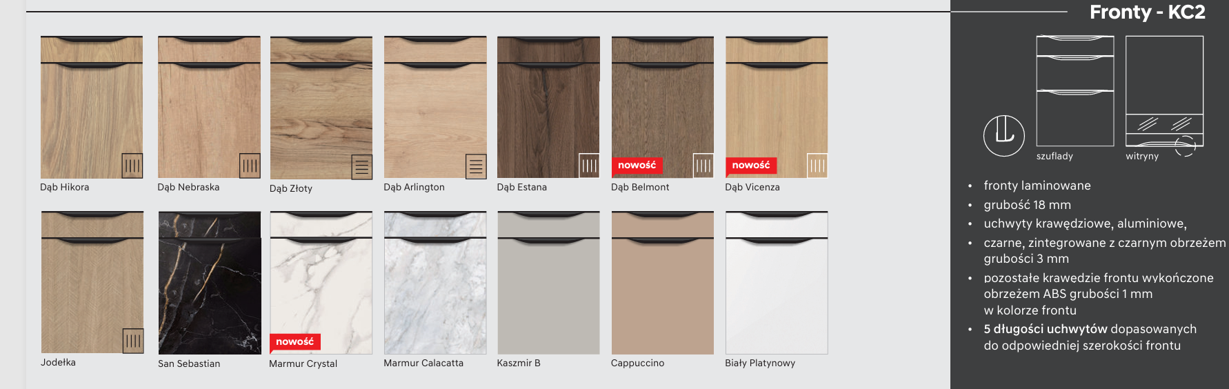 - Fronty: frezowane, wykonane z wysokiej jakości płyty MDF foliowanej