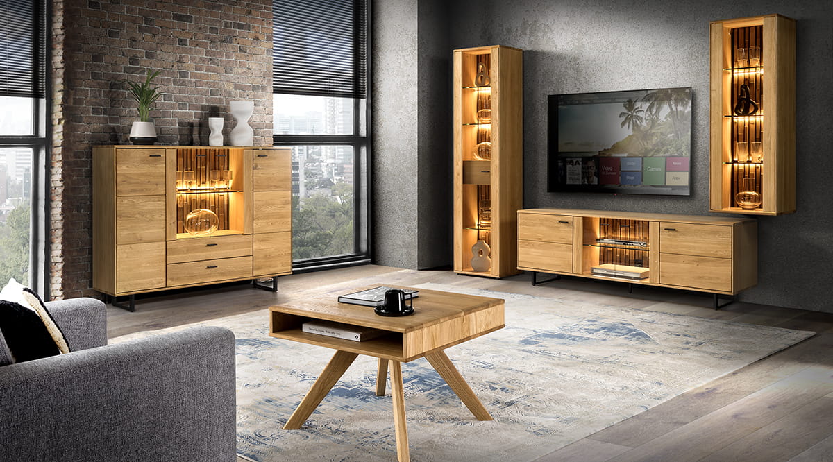 Kolekcja mebli TRAMONTO, z dębiny sękatej z naturalną woskowaną i olejowaną powierzchnią, czarnymi dodatkami i pełnymi wdzięku bryłami mebli wprowadzą do wnętrz salonu prawdziwy śródziemnomorski powiew.