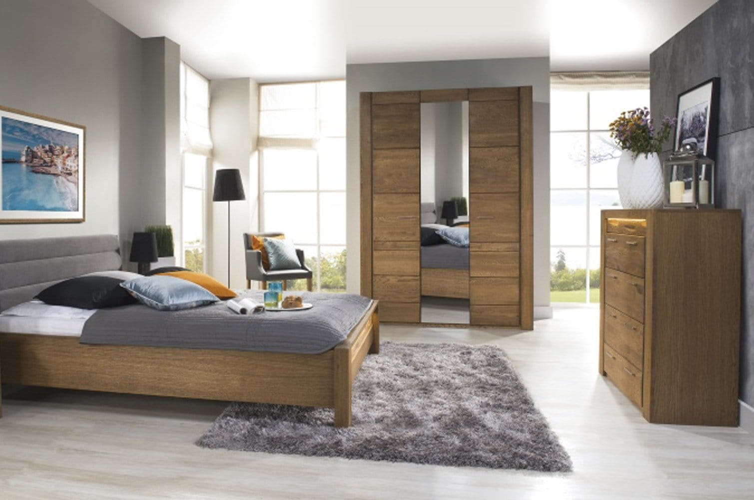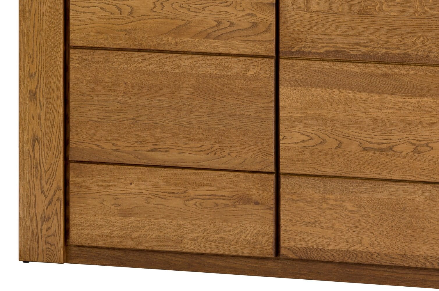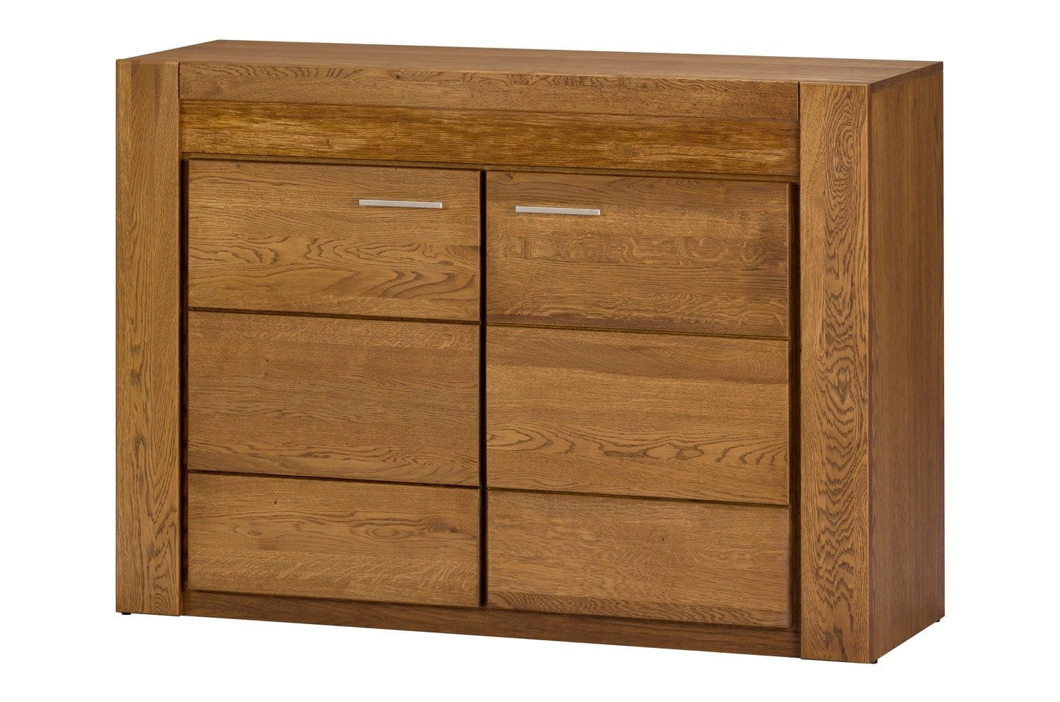 Fronty komody zostały wykonane z litego drewna, co nadaje meblowi nie tylko trwałości, ale i niepowtarzalnego charakteru. Korpus wykończony naturalną okleiną w kolorze dąb rustical podkreśla urok usłojenia i wpisuje się w najmodniejsze aranżacje. Szczególną uwagę przyciąga element dekoracyjny ze szczotkowanego drewna, który nadaje komodzie wyrazistości i ekskluzywnego wyglądu.