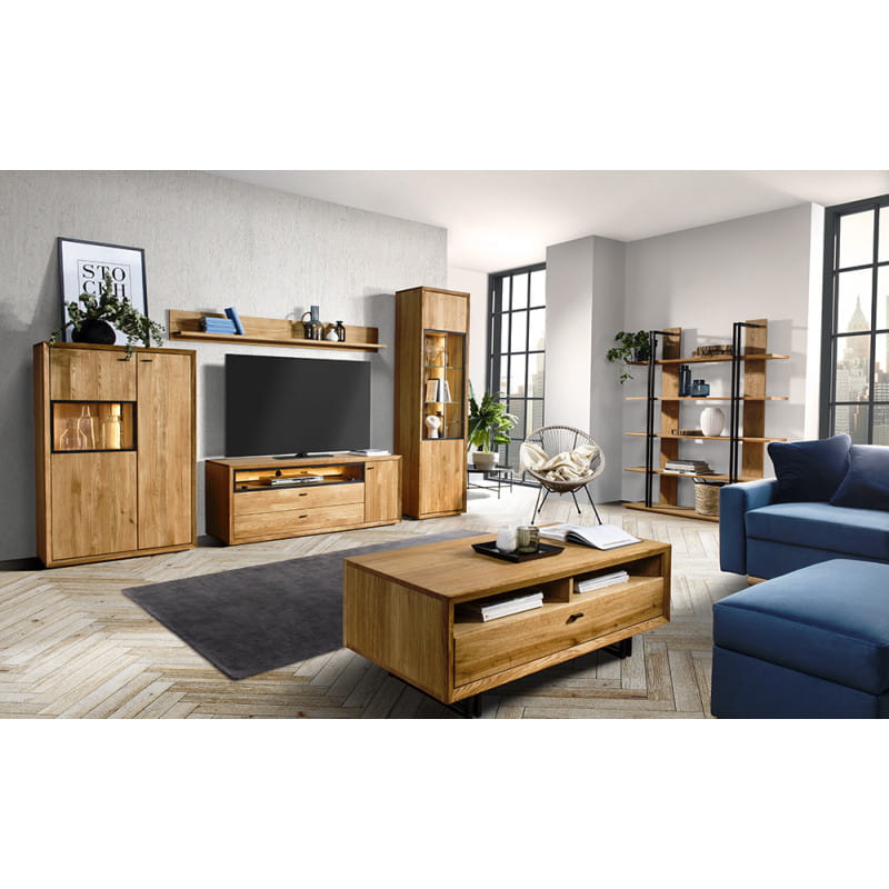 Dobry projekt mówi sam za siebie: brak popisu, przeciążenia optycznego, a jednocześnie imponujący kształt. Takim projektem, bez żadnych wątpliwości jest kolekcja mebli VIGO, która przekonuje wyrazistymi kształtami, dyskretną elegancją i efektownymi dodatkami. Harmonijne połączenie szczotkowanego litego drewna dębowego i spokojnych metalowych akcentów tworzy zmysłowy ogólny wygląd. Niezależnie od tego, czy są to kredensy, panele czy witryny - tutaj możesz projektować w różnorodny i dyskretny sposób. Specjalne szczegóły, takie jak podświetlana ściana tylna, oraz loftowe dodatki ustawiają ten mebel idealnie na ścianie. Model Vigo to spełnienie marzeń o indywidualnym, stylowym wnętrzu z litego drewna - prostym, wyrazistym z dużą ilością użytecznej przestrzeni do przechowywania.