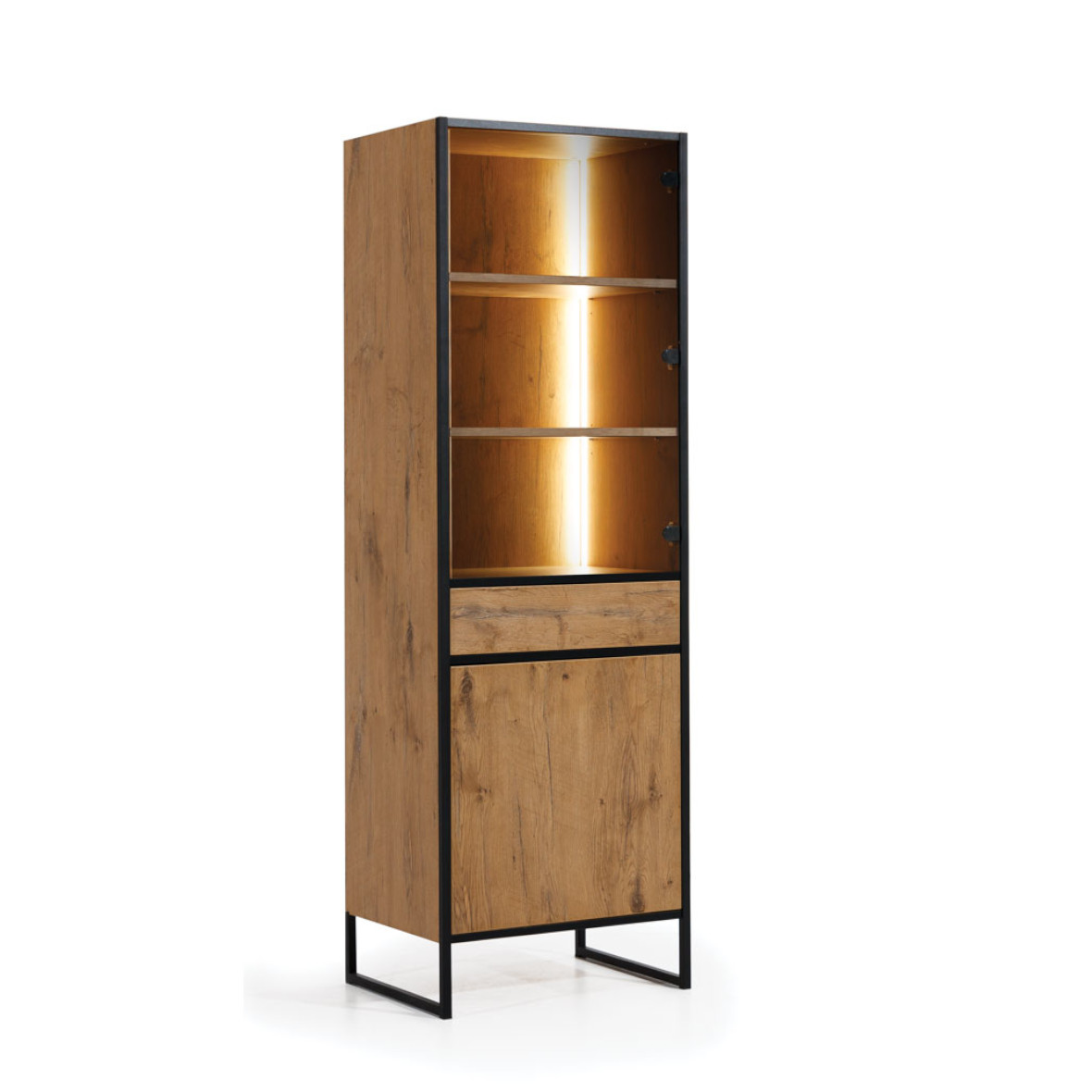 Oryginalna witryna w loftowym stylu. Wykonana z płyty meblowej w ciepłym kolorze Dąb Lancelot oaz czarnego metalu. Dwoje otwieranych drzwi (jedne z płyty, jedne szklane) oraz praktyczna szuflada zamykana systemem push & pull zapewnią wiele miejsca na przechowywanie i eksponowanie przedmiotów. Podświetlenie ledowe ciepłym światłem podkreśli piękno prezentowanych przedmiotów.